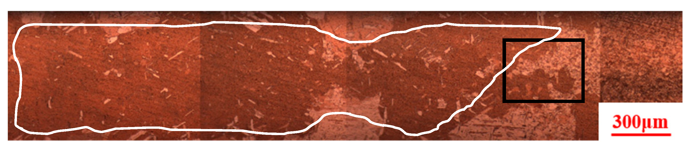 When the heating temperature is 750 °C and the drawing rate is 20 μm s−1, the microstructure at the interface between the columnar grains and their leading equiaxed grains in the directional heat-treated structure is shown in Figure 13. The white curve represents the columnar crystal structure, and the black square represents the front interface of the columnar crystal. With a pulling direction from right to left, continuously grown columnar grains approximately 2.5 mm in length are observed on the left, while fine equiaxed grains with an average size of about 5 μm are present on the right.
