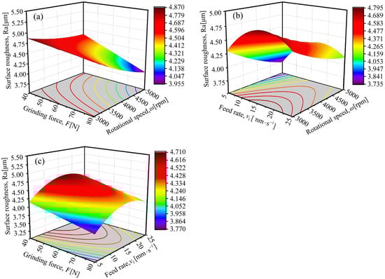 As shown in Figure 3b,c, the response surfaces of “feed rate—rotational speed” and “grinding force—feed rate” both exhibit a “saddle surface” morphology. This indicates that their interaction significantly influences Ra. When the rotational speed or grinding force is held constant, Ra first increases and then decreases with rising feed rate, peaking at 15 mm·s−1. When feed rate is fixed, Ra generally shows a gradual downward trend with the increase in rotational speed or grinding force.