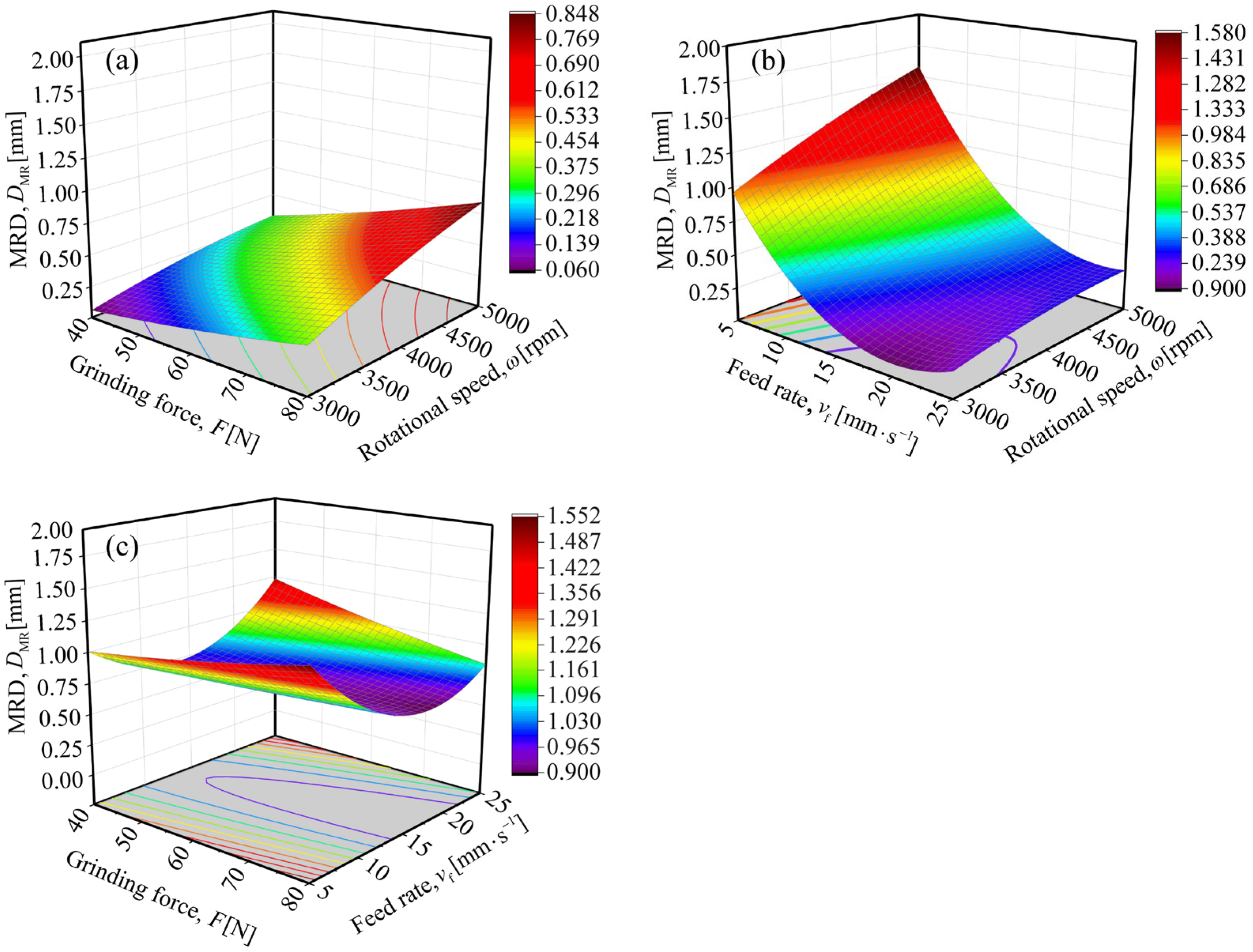 - V1: F = 70 N, vf = 20 mm·s−1, ω = 3000 rpm → DMR = 1.82 mm, Ra = 3.85 μm;