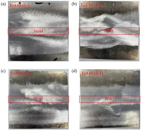 During the testing phase, weld components were extracted from 5 mm thick aluminum alloy plates to fabricate test specimens. Subsequently, aluminum plates with the thickness of 5 mm were sectioned to yield test blocks conducive to X-ray detection. Figure 1 illustrates the segmented test blocks, with weld seams meticulously polished. Complying with relevant standards and guided by photo results, the evaluation area for welded joint assessment is established at 10 mm × 10 mm for metals with thicknesses below 20 mm. The standard specimen used for fatigue testing is precisely collected and processed from the centerline position of the weld seam of the above-mentioned test block to ensure that its gauge length fully includes the weld metal within the evaluation area.