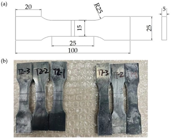 Fatigue specimen size and physical drawing: (a) Fatigue specimen size (mm). (b) Physical drawing of fatigue specimen.
