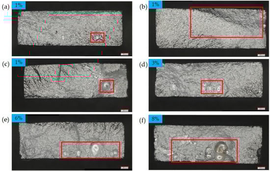 Fatigue fracture morphology with different porosity: (a) 1%; (b) 1%; (c) 1%; (d) 3%; (e) 6%; (f) 8%.