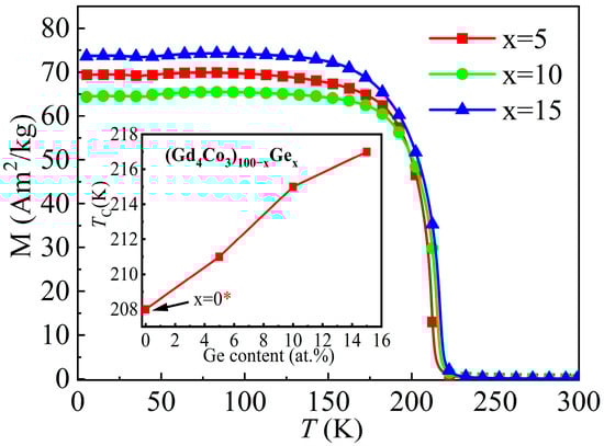 To analyze the magnetic properties of the as-spun (Gd4Co3)100−xGex ribbons, their magnetization changes were tested in the temperature range of 5–300 K, and the corresponding M–T curves are displayed in Figure 3. Upon heating, a sharp drop in magnetization is detected—a hallmark of the ferromagnetic (FM) to paramagnetic (PM) phase transition. For the alloys where x = 5, 10, and 15, the corresponding Curie temperatures (TC) are determined to be 211, 215, and 217 K, respectively. Notably, TC exhibits an almost linear increase with higher Ge content, as illustrated in the inset of Figure 3. This trend aligns well with the behavior previously observed in Gd65Mn35−xGex (x = 5, 10) alloys [].