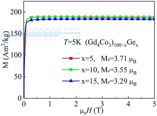 Figure 4 presents the isothermal magnetization (M–H) curves of the as-spun (Gd4Co3)100−xGex ribbons measured at 5 K with the applied field increasing from 0 to 5 T. All alloys reach magnetic saturation at low fields. The saturation magnetization (MS) values, obtained by extrapolating the high-field magnetization data to zero field, are 188.4, 189.4, and 184.7 A·m2/kg for x = 5, 10, and 15, respectively—corresponding to 3.71, 3.55, and 3.29 μB per magnetic atom. The calculated magnetic moments per Gd atom are 6.83, 6.91, and 6.76 μB/Gd, respectively, which are slightly lower than the experimental MS of the free Gd3+ ion (7.55 μB) []. This reduction is attributed to antiparallel spin coupling in the secondary Gd–Co sublattice [].