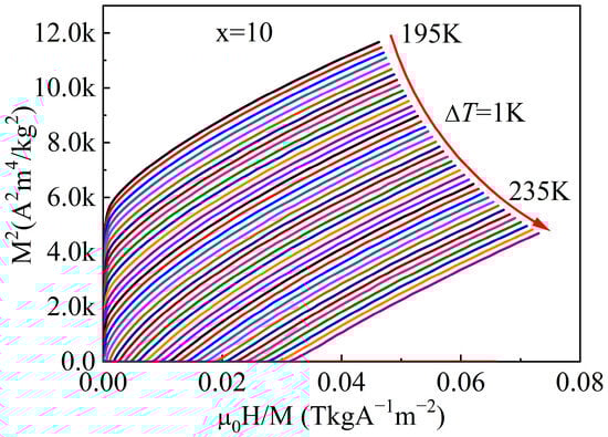 According to the mean-field theory [], Arrott plots should consist of a series of parallel straight lines in the vicinity of TC and pass through the origin at T = TC. To construct such lines, modified Arrott plots (MAPs; see Equation (8)), which are based on the Arrott–Noakes equation of state [], were employed. For the analysis, only the high-field linear region was adopted, since low-field plots show slight curvature caused by mutually misaligned magnetic domains [].
