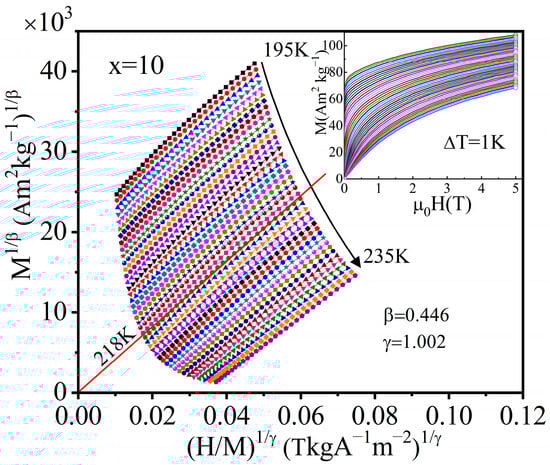 For such second-order magnetic transitions (SOMTs), a set of critical exponents is typically used for characterization [,,]: β (describing the temperature dependence of spontaneous magnetization MS), γ (characterizing the inverse initial susceptibility χ−1), and δ (relating to the critical magnetization isotherm at T = TC).
