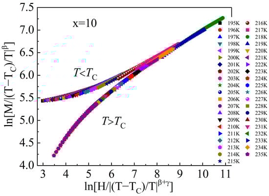 The scaled plots of m versus h, constructed using the critical exponents β, γ, and δ obtained from the Kouvel–Fisher (KF) method, are presented in Figure 9. On a log-log scale, all data points collapse onto two distinct branches for T > TC and T ˂ TC, confirming the accuracy of the determined critical exponents.