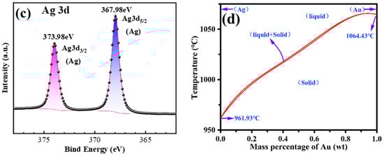 Characterization of the initial feedstock: (a) XRD pattern; (b,c) XPS spectra; (d) Au–Ag binary phase diagram.
