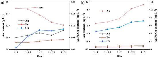 Effects of the O/A ratio on the metal content in (a) the extraction phase and (b) the raffinate during extraction.