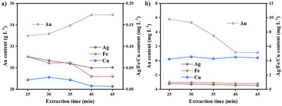 Extraction time significantly affects gold extraction efficiency. An insufficient extraction time may lead to incomplete recovery, whereas an excessive extraction time can increase energy consumption and the risk of side reactions. Under fixed conditions (extraction temperature: 298 K; phase ratio O/A: 1:1.5), the effect of extraction time on the concentrations of Au and impurity elements (Ag, Fe, Cu) in both the organic phase and raffinate was investigated, as illustrated in Figure 7.