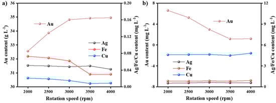 The centrifugation speed is a critical operational parameter in gold extraction, significantly influencing phase separation efficiency, mass transfer kinetics, and overall gold recovery. This section investigates the impact of centrifugation speed on the concentrations of Au and impurity elements (Ag, Fe, Cu) in both the organic and aqueous phases under controlled conditions (temperature: 298 K; phase ratio O/A: 1:1.5; extraction time: 40 min), as shown in Figure 8.