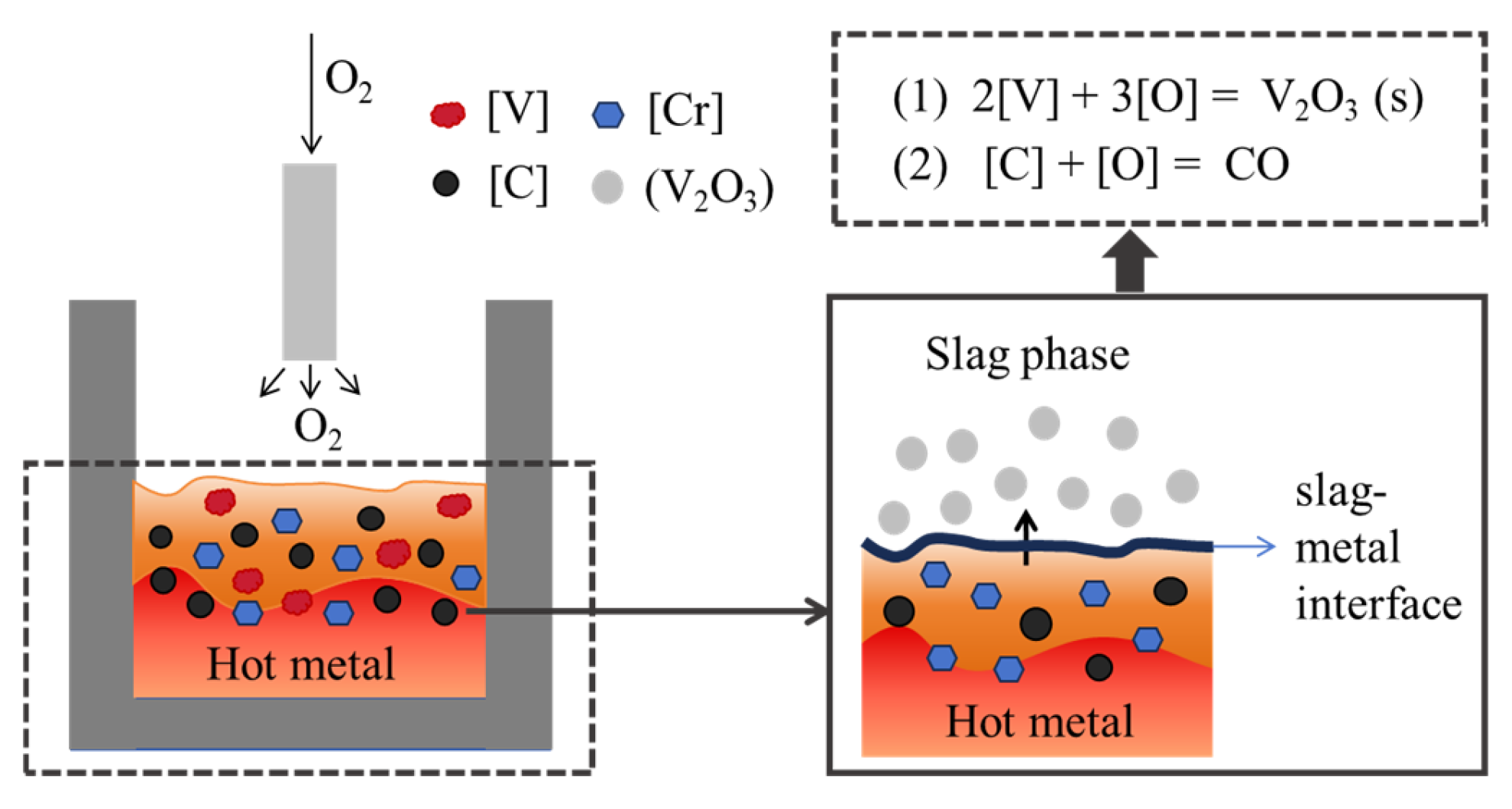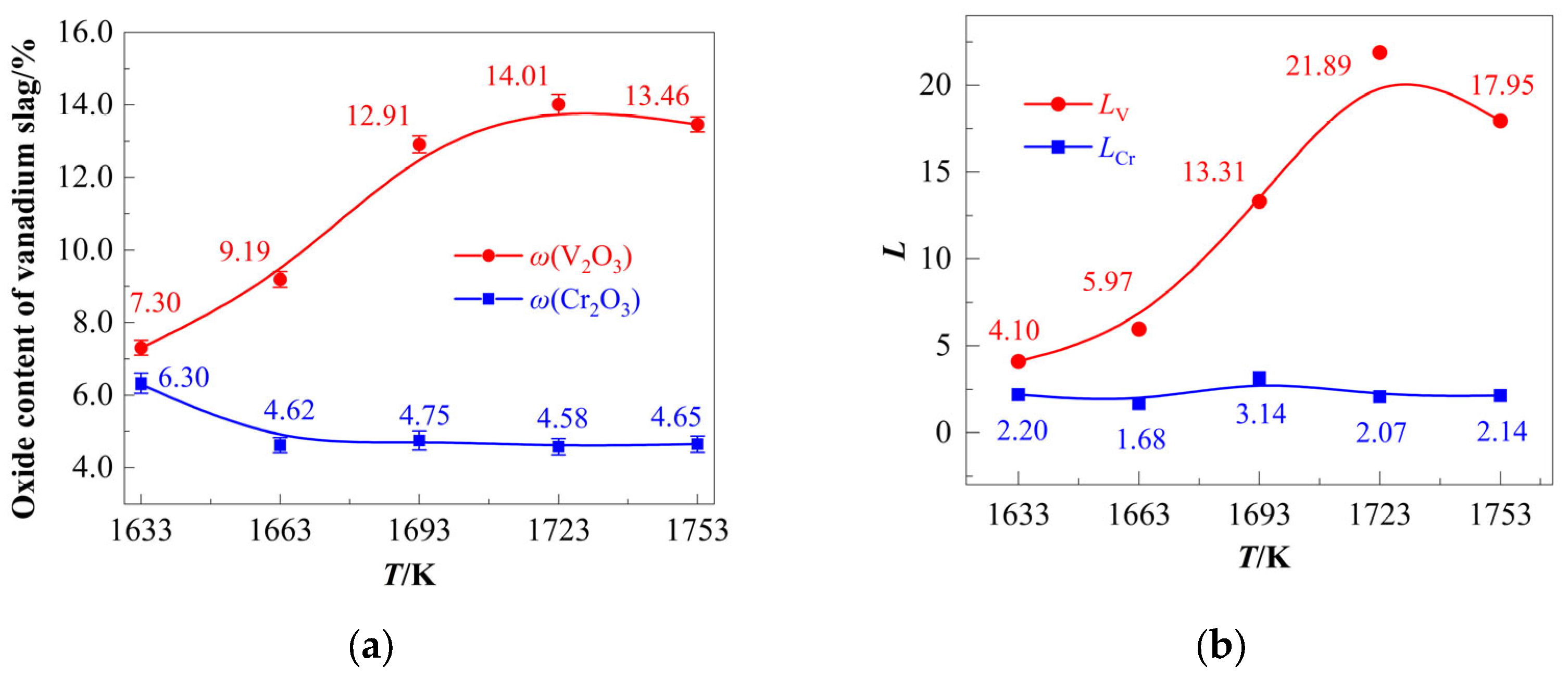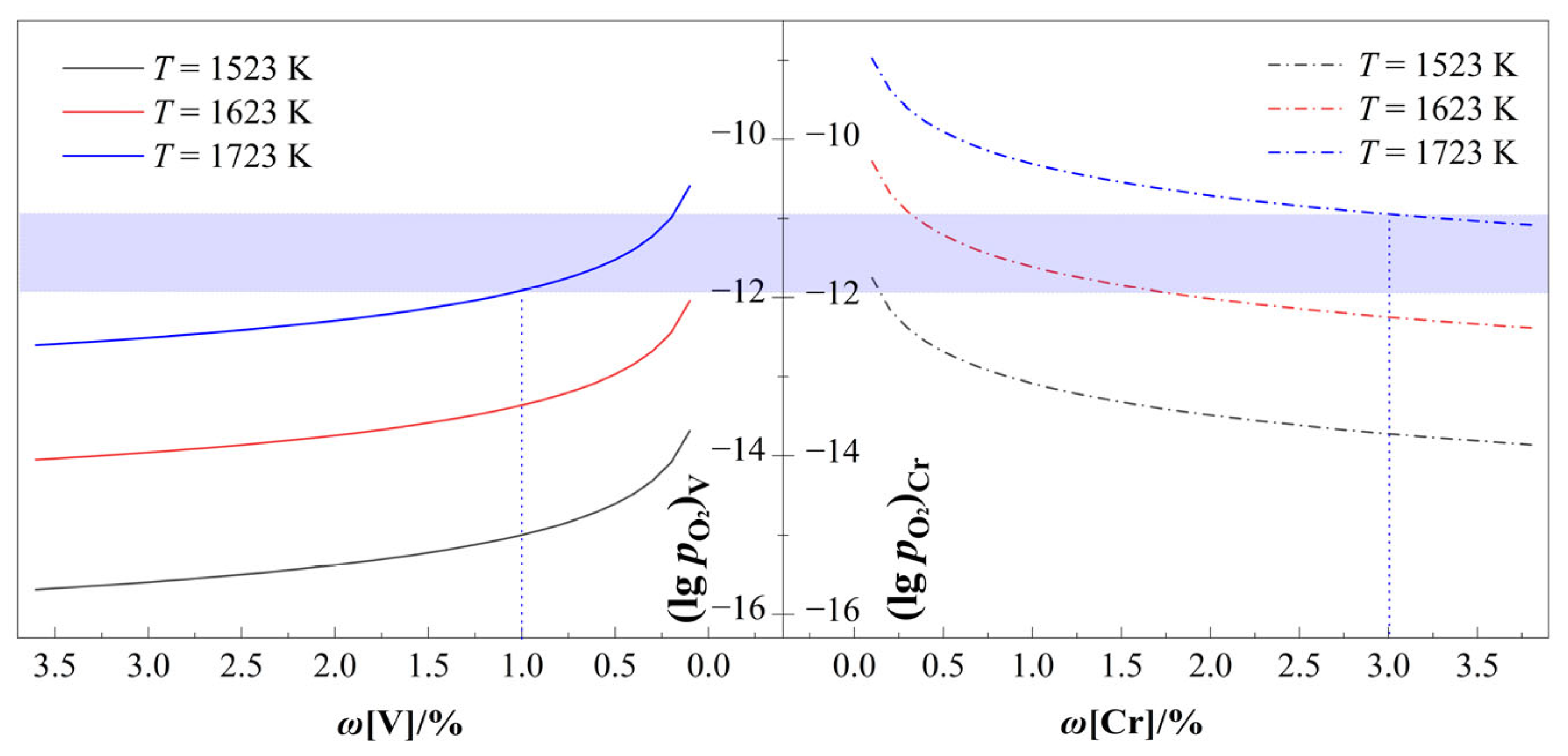 - The thermodynamic analysis established that the temperature window of 1517–1704 K is critical, as it enables carbon to function as an effective redox mediator. Within this regime, the oxidation priority of [V] > [C] > [Cr] creates a thermodynamic pathway for selective V extraction. Furthermore, there is a hierarchy of oxygen partial pressure required for oxidizing vanadium and chromium. An optimal oxygen partial pressure window of −11.91 to −10.94 (logarithmic scale) at 1723 K was identified to achieve high V oxidation while suppressing Cr loss. This theoretical prediction provides a key parameter window for optimizing experimental conditions, and its core conclusion is directly verified in subsequent experiments.