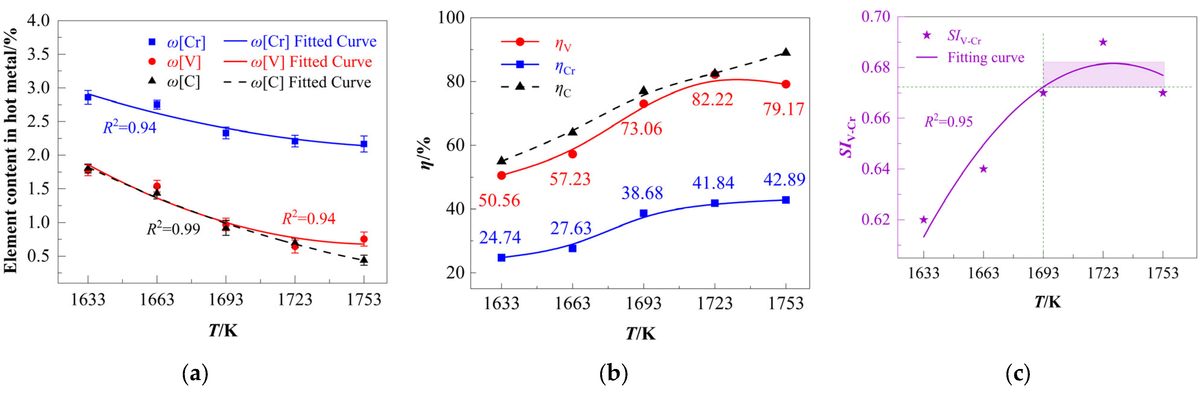 - Temperature-dependent experiments demonstrate the differential responses of ηV and ηCr: vanadium oxidation exhibits higher temperature sensitivity than chromium, a phenomenon attributed to the stronger protective effect of carbon on chromium compared to its promoting effect on vanadium extraction. The optimal temperature range is 1693–1753 K (SIV-Cr > 0.67). In the low-temperature region (<1693 K), vanadium oxidation is incomplete, whereas in the high-temperature region (>1753 K), the separation efficiency deteriorates.