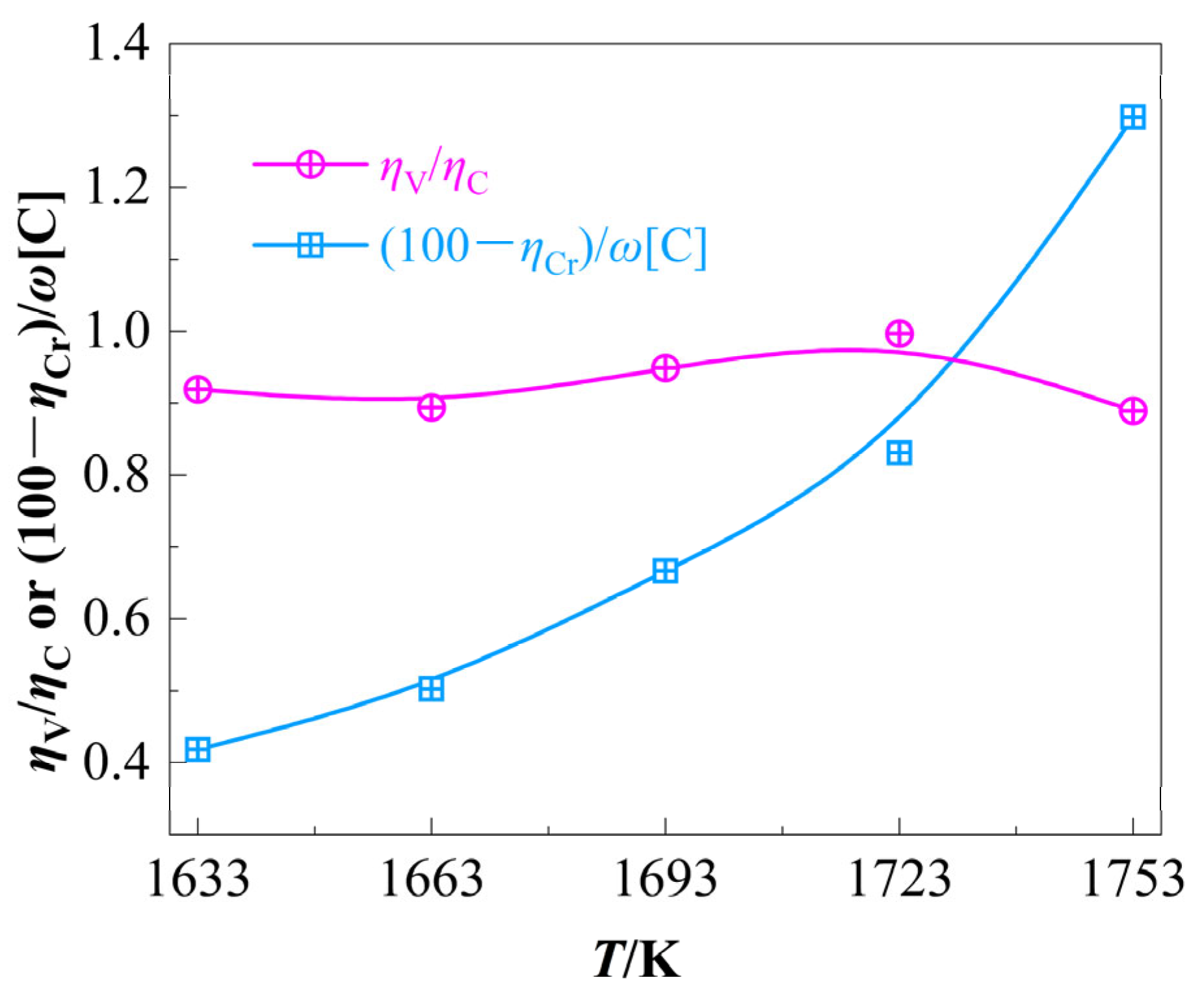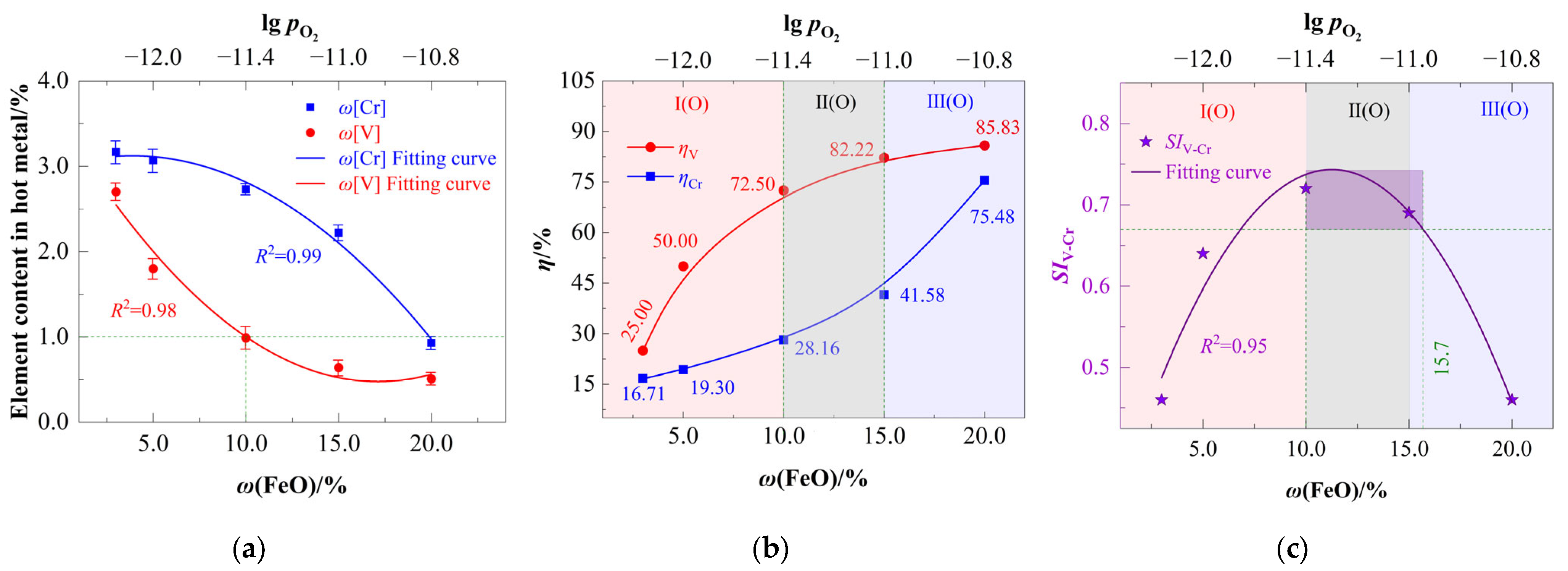 - Region I(O) (V-Dominant Zone, ω(FeO) = 3–10%): ηV increases sharply due to preferential vanadium oxidation (thermodynamically favored; Section 2.2), while ηCr increases marginally;