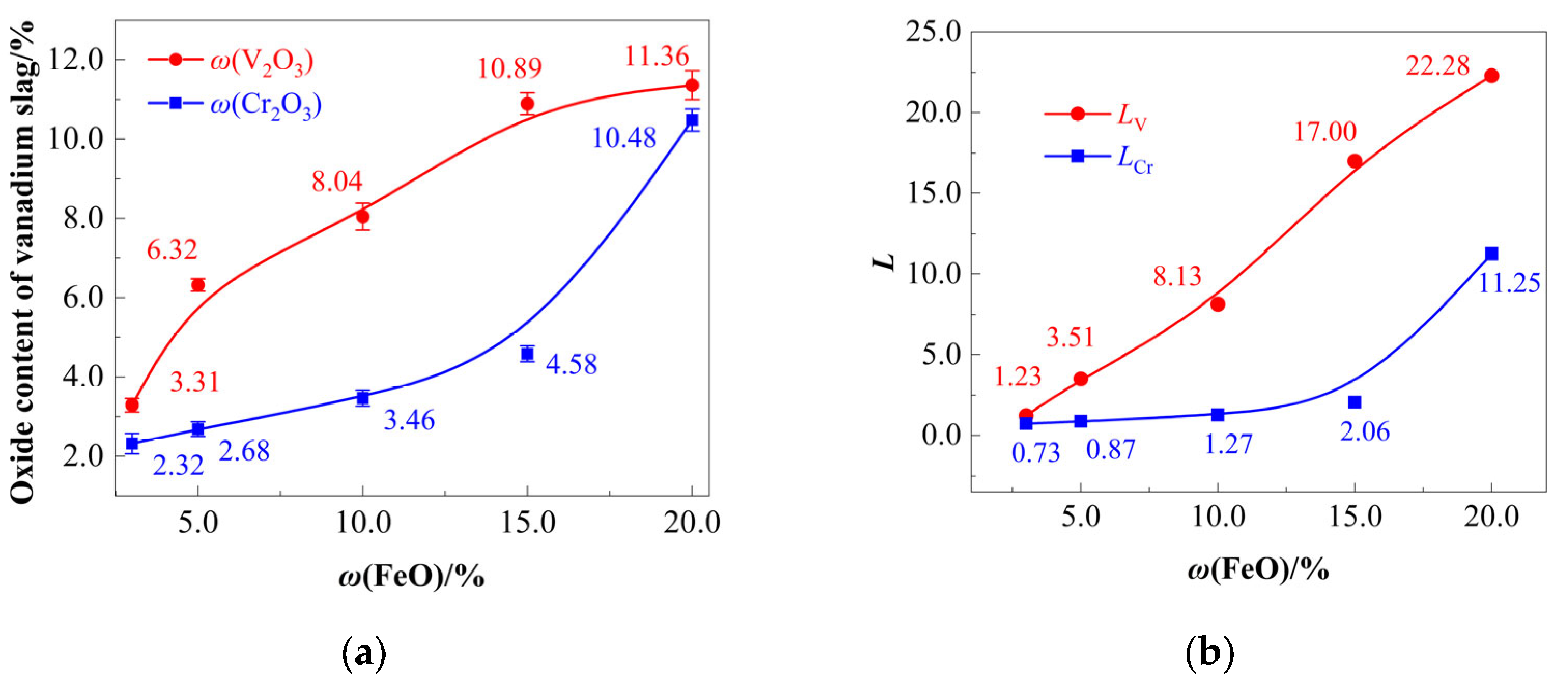 - Both ηV and ηCr increase upon adding FeO, with ηV consistently exceeding ηCr. [V] oxidation occurs preferentially at lower FeO dosages. The optimal FeO dosage range is 10.0–15.7%. FeO contents exceeding this range lead to the over-oxidation of [Cr], while insufficient FeO additions result in incomplete [V] oxidation.
