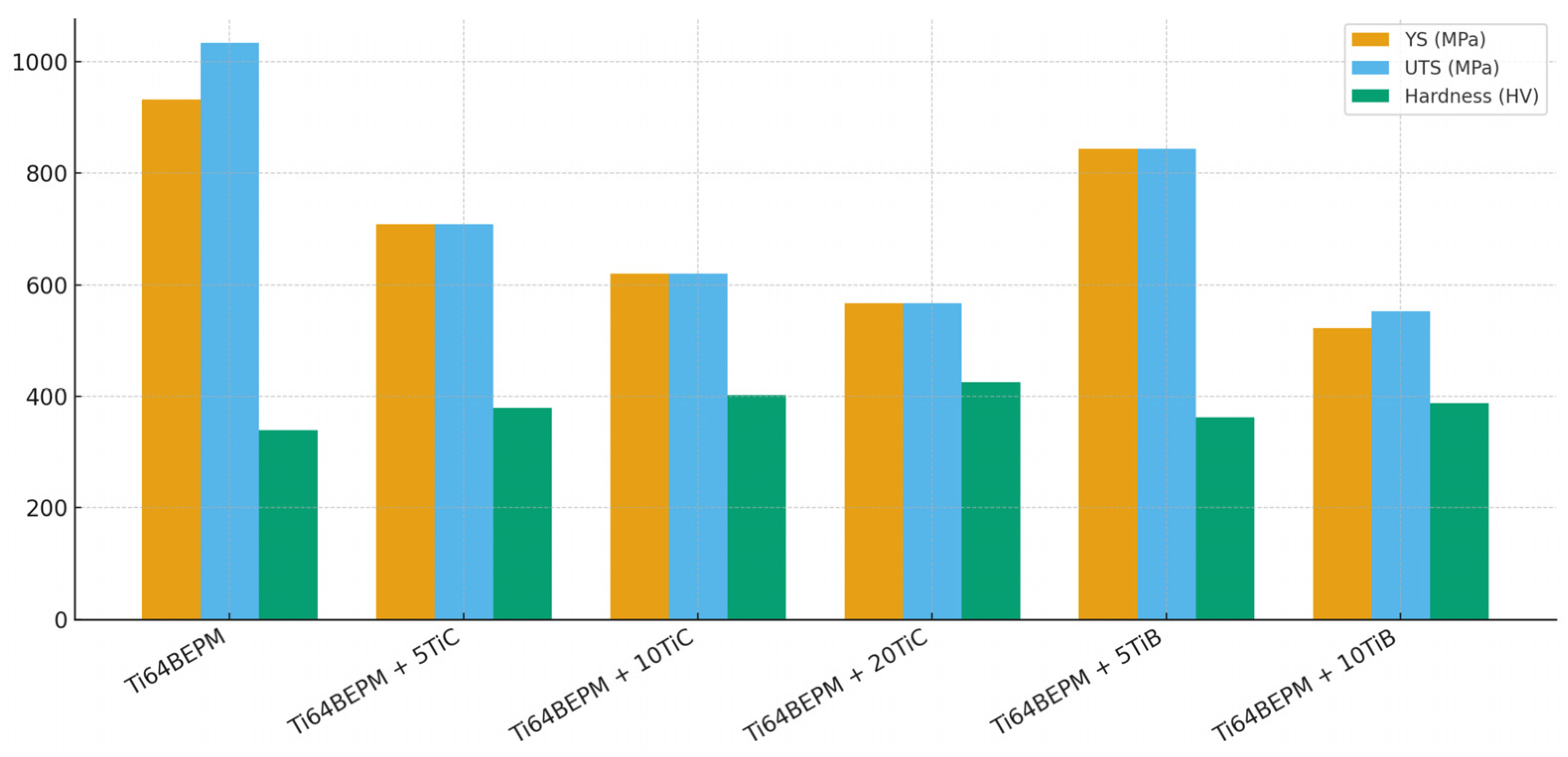 | Ti64 + Hybrid (TiC + TiB) | 1300 ± 55 | 480 ± 22 | 4.52 | 6.9 | [47] |