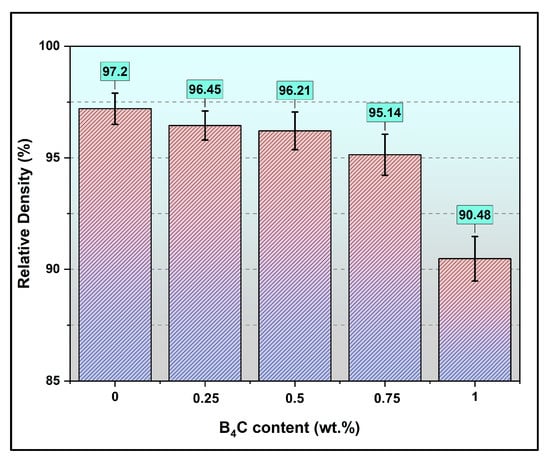 The relative density values of the Cu/h-BN/B4C composites are presented in Figure 4, showing a slight but consistent decrease with increasing amounts of B4C reinforcement. The highest relative density was observed in the unreinforced sample (S0), while the lowest relative density was recorded in the sample containing 1 wt.% B4C (S4). Specifically, the measured relative densities were 97.20% for S0, 96.45% for S1, 96.21% for S2, 95.14% for S3, and 90.48% for S4, confirming the gradual reduction illustrated in Figure 4. This decrease in density with increasing ceramic content is primarily attributed to the intrinsic characteristics of B4C, such as its high hardness and low ductility, which reduce the compressibility of the powder mixture during sintering. Furthermore, ceramic reinforcements often act as diffusion barriers during the sintering process, thereby impeding mass transport and densification at the matrix–reinforcement interfaces. Nevertheless, the use of spark plasma sintering (SPS) was found to be remarkably effective in achieving substantial densification across all specimens. SPS has been shown to promote rapid sintering kinetics due to the combined effects of pulsed electric current and mechanical pressure [,]. This process also minimizes porosity, even in systems containing refractory ceramic phases. The relative densities of all samples exceeding 95% confirm the efficiency of SPS in fabricating dense copper-based composites, even when incorporating hard and poorly sinterable reinforcements such as B4C. Additionally, the constant presence of 1 wt.% h-BN may have positively influenced powder compaction by acting as a solid lubricant during pressing, partially offsetting the densification hindrance caused by B4C. A marginal decline in density is evident with higher B4C additions; however, the final densification levels remain satisfactory for ensuring the desired mechanical and functional properties of the composites. Similar Cu–ceramic composite systems produced by SPS typically exhibit relative densities in the 92–97% range, and the values obtained in this study fall well within this interval, indicating comparable densification efficiency.