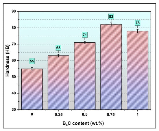The hardness behavior of the Cu/h-BN/B4C hybrid composites as a function of B4C content is illustrated in Figure 5. A progressive increase in Brinell hardness was observed with the incremental addition of B4C, with the unreinforced S0 sample exhibiting the lowest hardness and the 1 wt.% B4C-reinforced S4 sample displaying the highest. This phenomenon can be primarily attributed to the dispersion of ultra-hard B4C particles within the copper matrix, which act as effective barriers against dislocation motion during plastic deformation. As the B4C content increases, the number of these reinforcing barriers becomes more pronounced, thereby enhancing the composite’s resistance to indentation and surface wear. Furthermore, the microstructural refinement achieved via the SPS process plays a pivotal role in the development of hardness. The rapid heating and short sintering times inherent to SPS limit grain growth, resulting in a finer grain structure. According to the Hall-Petch relationship, this microstructural refinement enhances hardness by increasing grain boundary density, which acts as an additional barrier to dislocation motion. It is also hypothesized that the constant 1 wt.% h-BN content contributes to microstructural uniformity and particle dispersion due to its layered morphology and solid-lubricating properties, although its direct effect on hardness is less significant compared to B4C. The enhanced particle–matrix bonding and reduced porosity resulting from SPS further improve the mechanical integrity of the composite structure. The combined strengthening effects of dispersion hardening, grain boundary pinning, and improved interfacial bonding collectively underpin the substantial improvement in hardness, demonstrating the effectiveness of the dual-phase (h-BN/B4C) reinforcement strategy in addressing the mechanical limitations of pure copper [,]. Comparable studies on Cu/B4C systems report hardness increases of about 20–35% for similar reinforcement levels, and the present work shows values in the upper range of these reports. This agreement supports the dominant role of grain refinement and particle strengthening observed here. For instance, Cu/1 wt.% B4C composites reported in the literature typically reach 75–95 HB, closely matching the hardness improvement trend observed in the S1–S4 samples of this study. Quantitatively, the S3 specimen (0.75 wt.% B4C) exhibits about a 30% increase in hardness compared with the unreinforced S0 sample, supporting its designation as the optimal composition in this series.