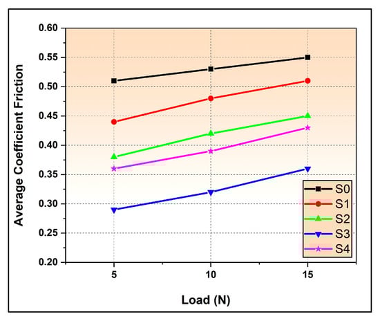 Figure 10 illustrates the relationship between average friction coefficient and load, showing that friction increases with load for all specimens; however, the absolute level of this increase is markedly suppressed by the addition of B4C. The S0 specimen, containing only 1 wt.% h-BN, exhibits the highest coefficients at every load (0.51–0.55), due to the Cu matrix’s susceptibility to plowing and micro-cutting. With B4C incorporation, enhanced hardness and load-bearing capacity—together with a more continuous h-BN-derived transfer film—lead to a gradual reduction in friction. This trend indicates that the S3 composition (0.75 wt.% B4C) achieves the most favorable balance between the hard and lubricating phases, establishing a low-shear sliding regime and yielding the minimum average friction across all three loads. When the B4C content is increased to 1 wt.% (S4), the friction rises again relative to S3 (0.36–0.43), which can be attributed to B4C agglomeration during SPS and localized densification losses (micro-porosity) that promote third-body abrasion and partial film disruption. Nevertheless, S4 still exhibits substantially lower friction than S0.