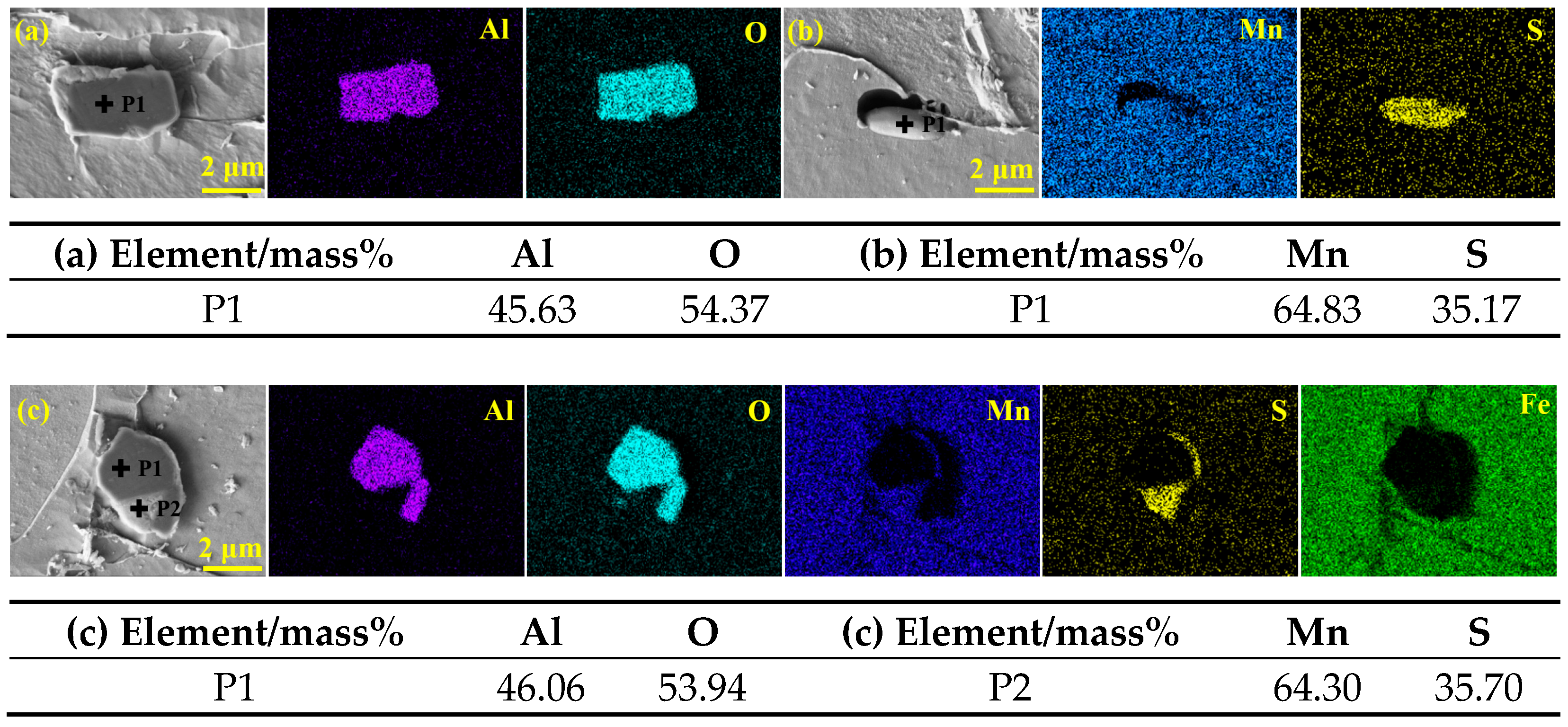 3.1. SEM-EDS Analysis of Chemical Compositions and Morphologies of Inclusions