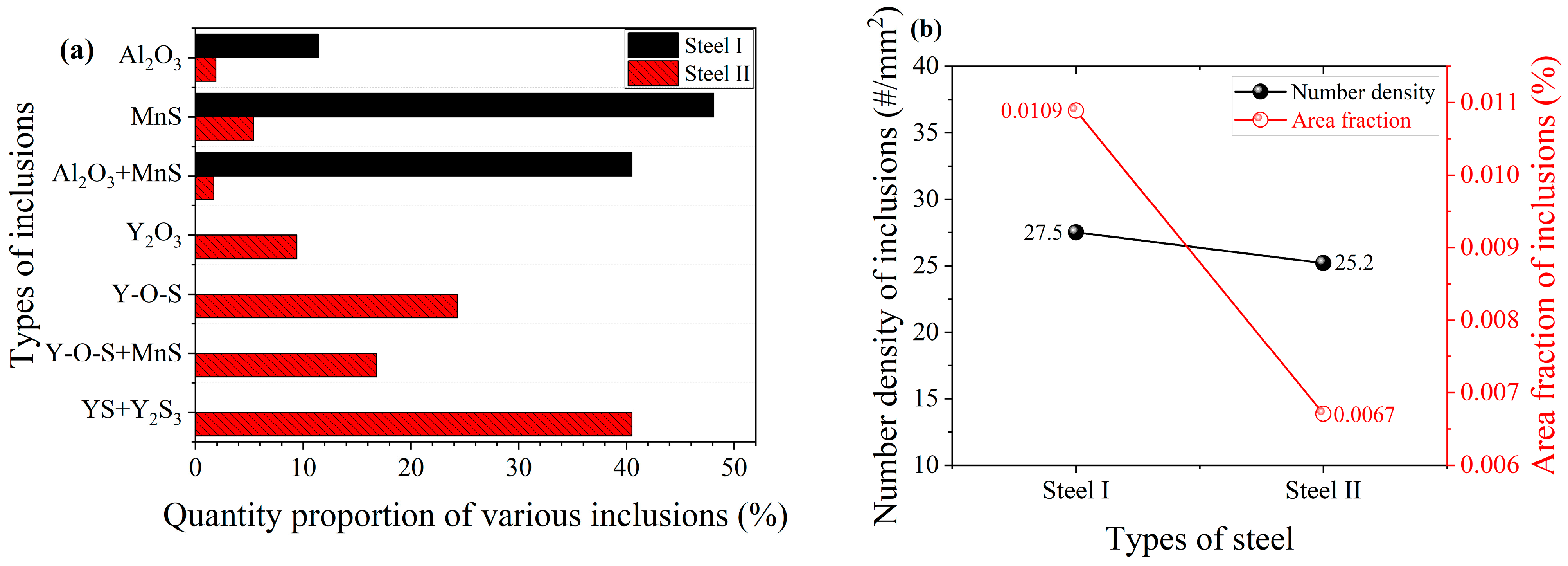 - With the addition of rare earth yttrium, the average diameter of inclusions decreases from 3.5 μm to 2.8 μm, accompanied by a decrease in aspect ratio from 2.2 to 1.7; the inclusions are refined and spheroidized. In addition, the number density and area fraction of inclusions in the steels are reduced from 27.5 per mm2 and 0.0109% to 25.2 per mm2 and 0.0067%, respectively.