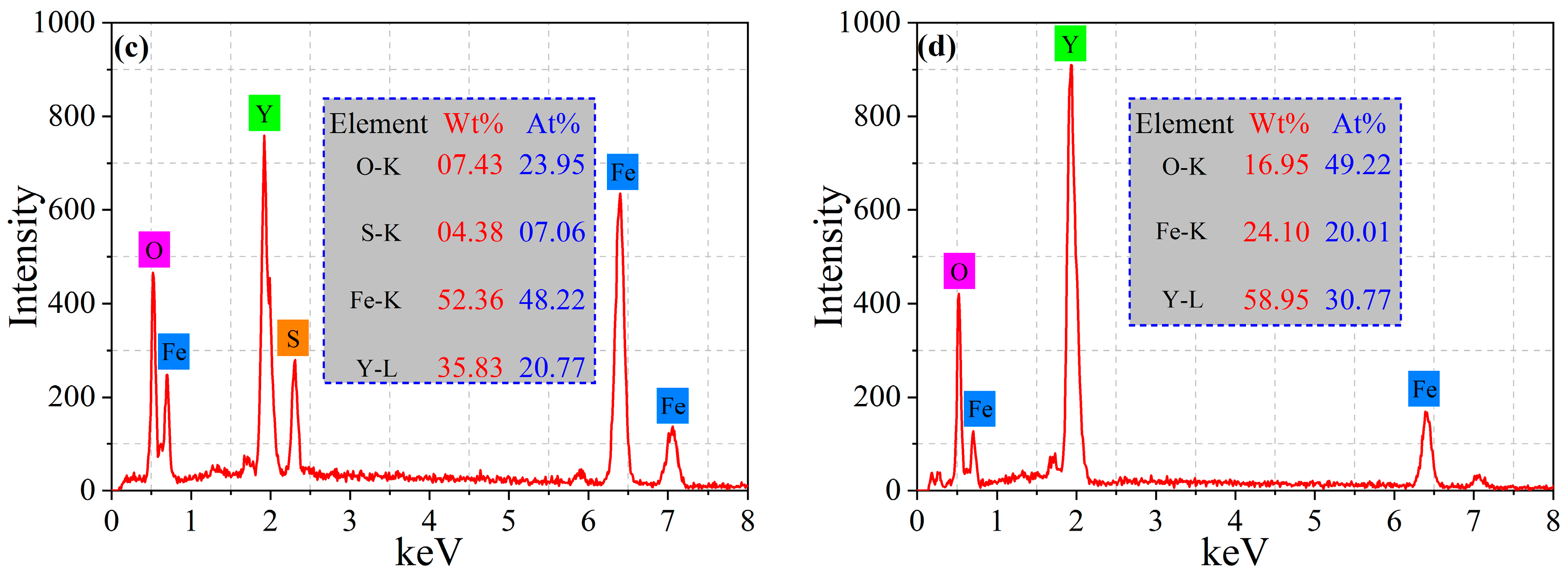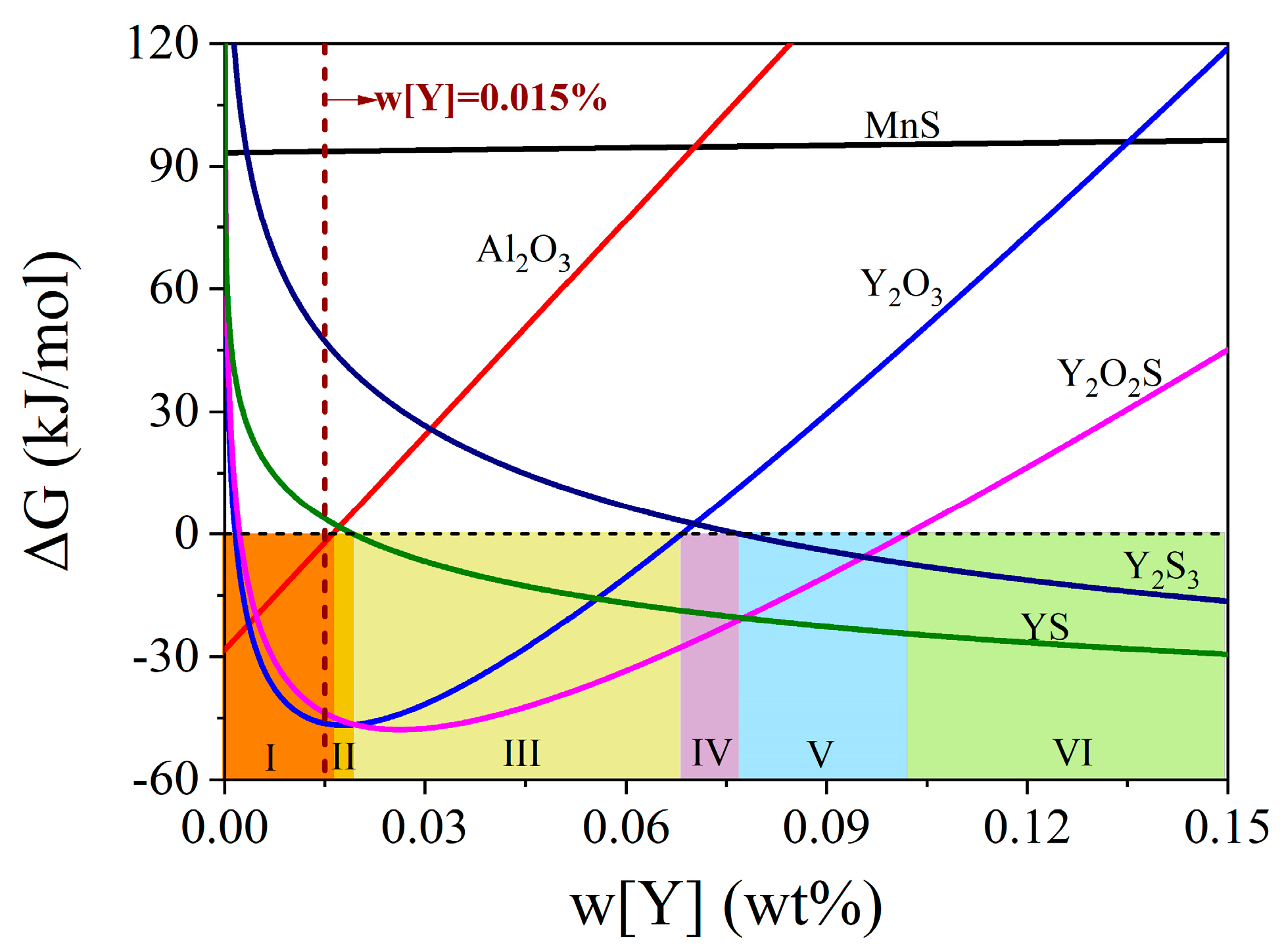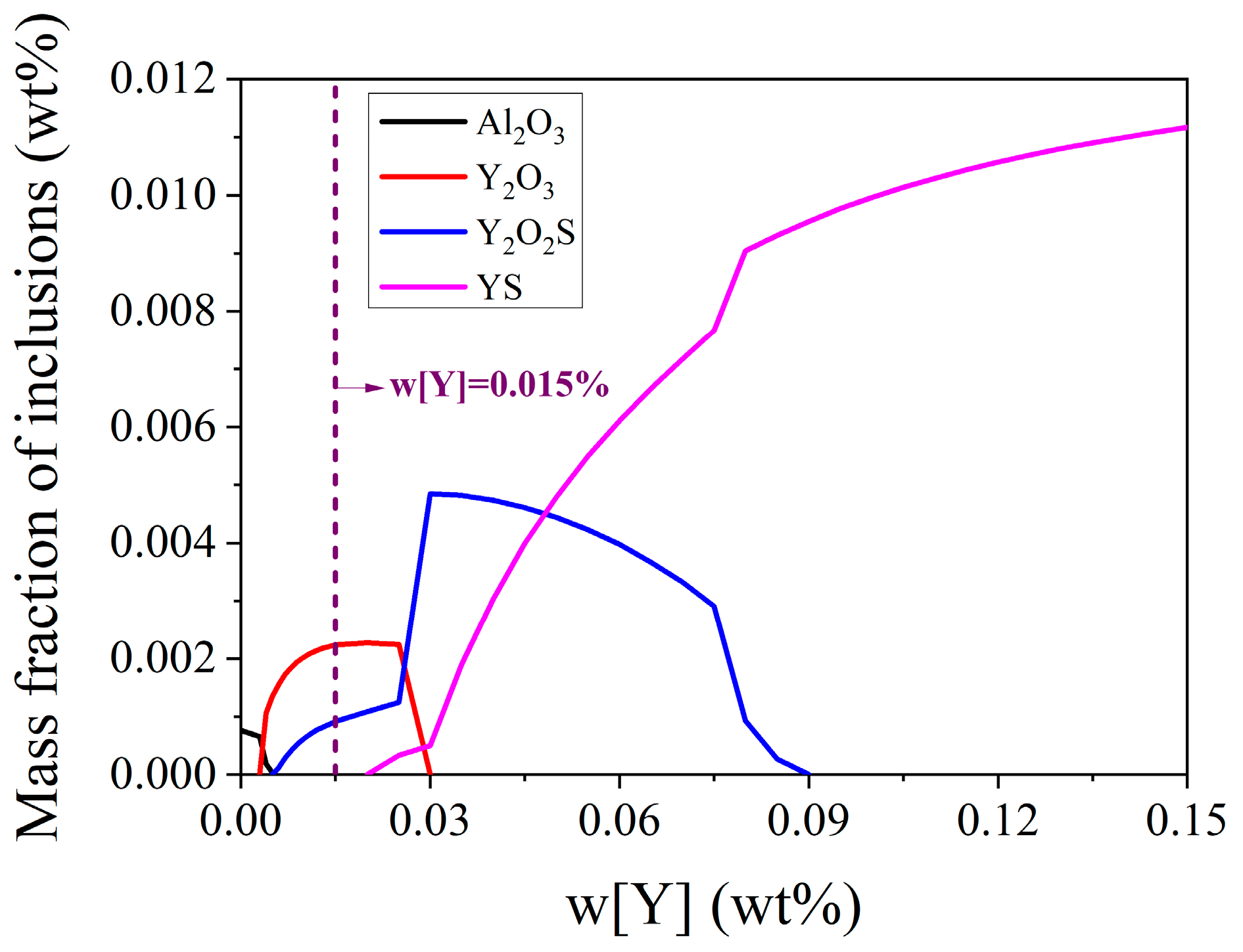 - The thermodynamic theoretical calculation results are essentially in agreement with the experimental observations. After adding rare earth yttrium, the evolution route of inclusions in the steel at 1600 °C is Al2O3→Y2O3 + Y2O2S. As the temperature decreases, YS and Y2S3 gradually precipitate instead of MnS, with Y2S3 mainly precipitating after the steel solidifies.