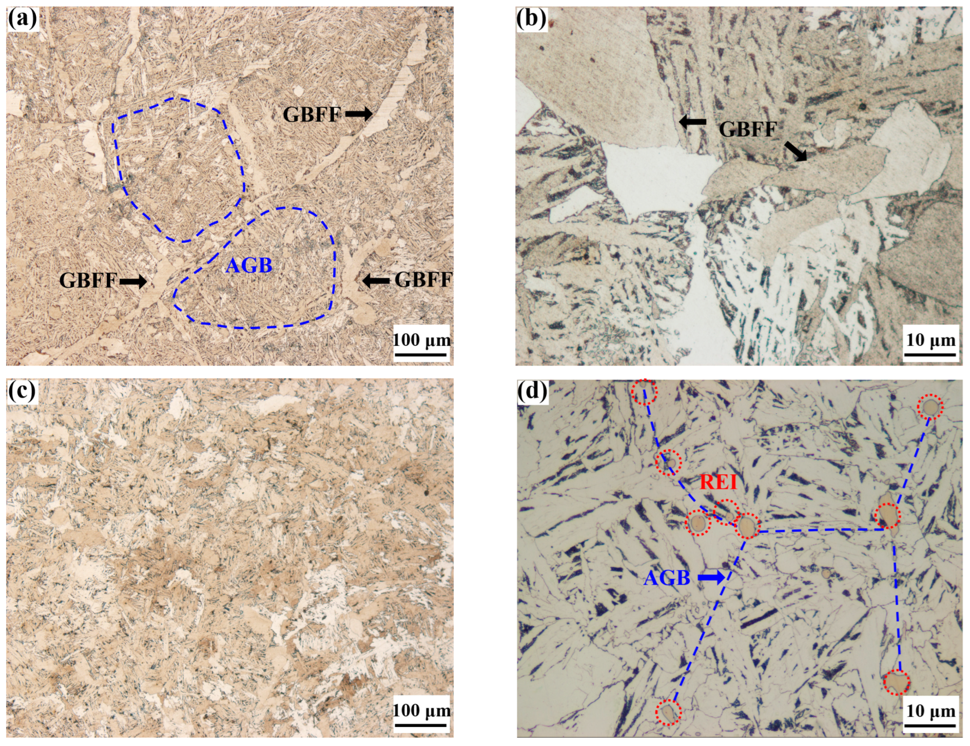 - Fei, G.; Chengwu, Z.; Pei, W.; Dianzhong, L. Effect of Rare Earth Elements on Austenite-Ferrite Phase Transformation Kinetics of Low Carbon Steels. Chin. J. Mater. Res. 2023, 37, 495–501. [Google Scholar] [CrossRef]