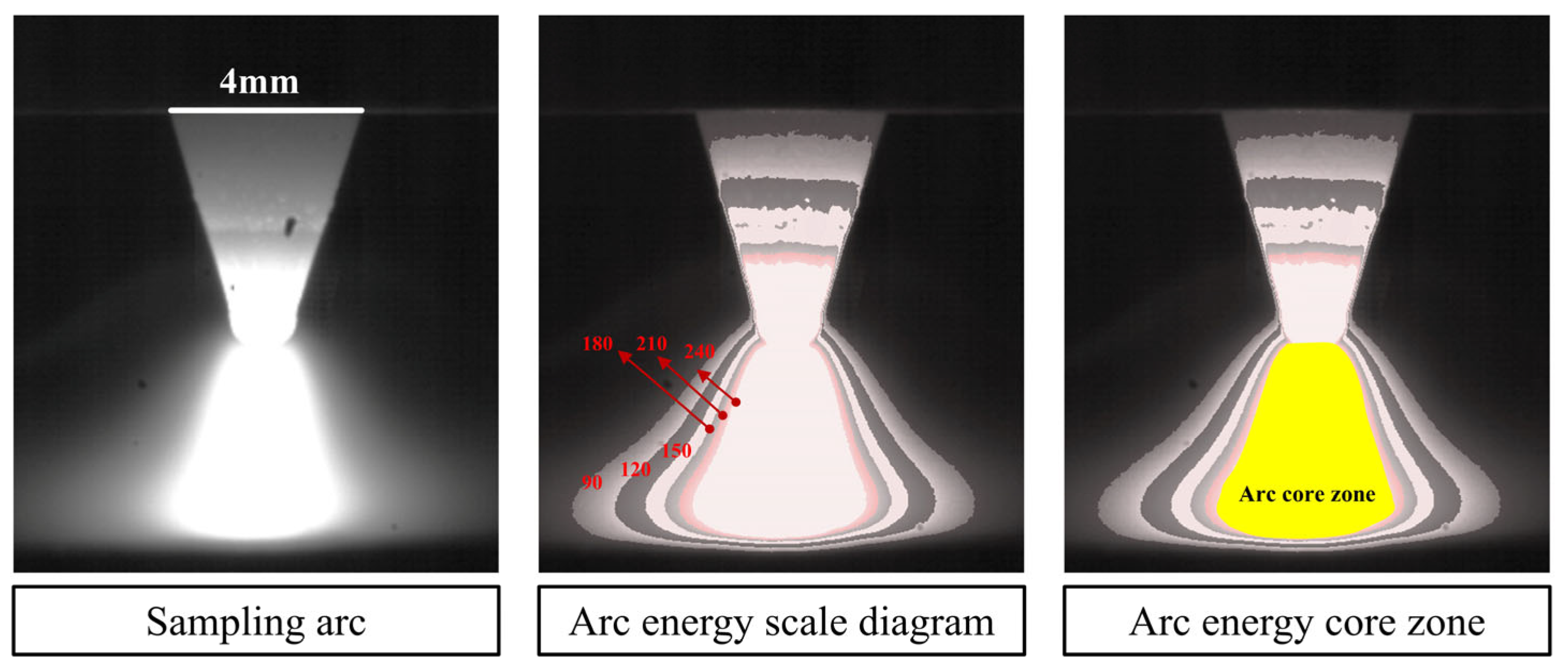 Current sensors and oscilloscopes (DSOX4034A, Keysight Technologies, Santa Rosa, CA, USA) were used to collect waveforms of welding current signals, using a high-speed camera (Phantom VEO 710S, Vision Research, Wayne, NJ, USA) with a sampling rate of 28,000 fps and an exposure time of 1μs to capture the arc contour. When shooting, the camera and welding gun were at the same horizontal line, the lens was focused on the tip of the tungsten electrode, and the tungsten electrode diameter of 4 mm was used as the arc analysis ruler. With the help of image processing software, the arc was stratified in energy levels according to different gray values as shown in Figure 2. Based on the core energy theory, the core area of the arc energy was defined. The gray value of 240 was set as the core area of the arc, and the gray value of 90 was set as the edge area of the arc. The brightness of arc plasma reflects the thermal energy of the arc. According to optical and image processing theories, the light intensity of a region is determined by multiplying the gray value by the area. Arc energy can be expressed as E = G · S (E = arc energy, G = gray value, S = area of the region).