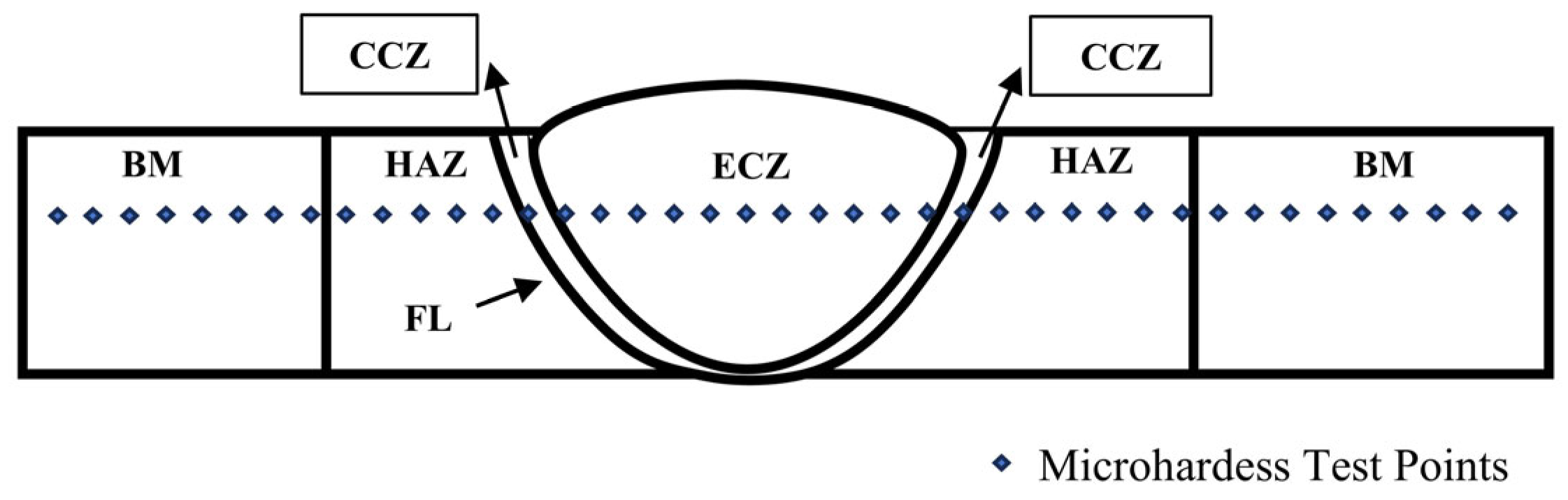Figure 3. Schematic diagram of hardness sample testing (ECZ: equiaxed crystals zone, CCZ: columnar crystals zone, FL: fusion line, HAZ: heat affected zone, BM: base metal zone).
