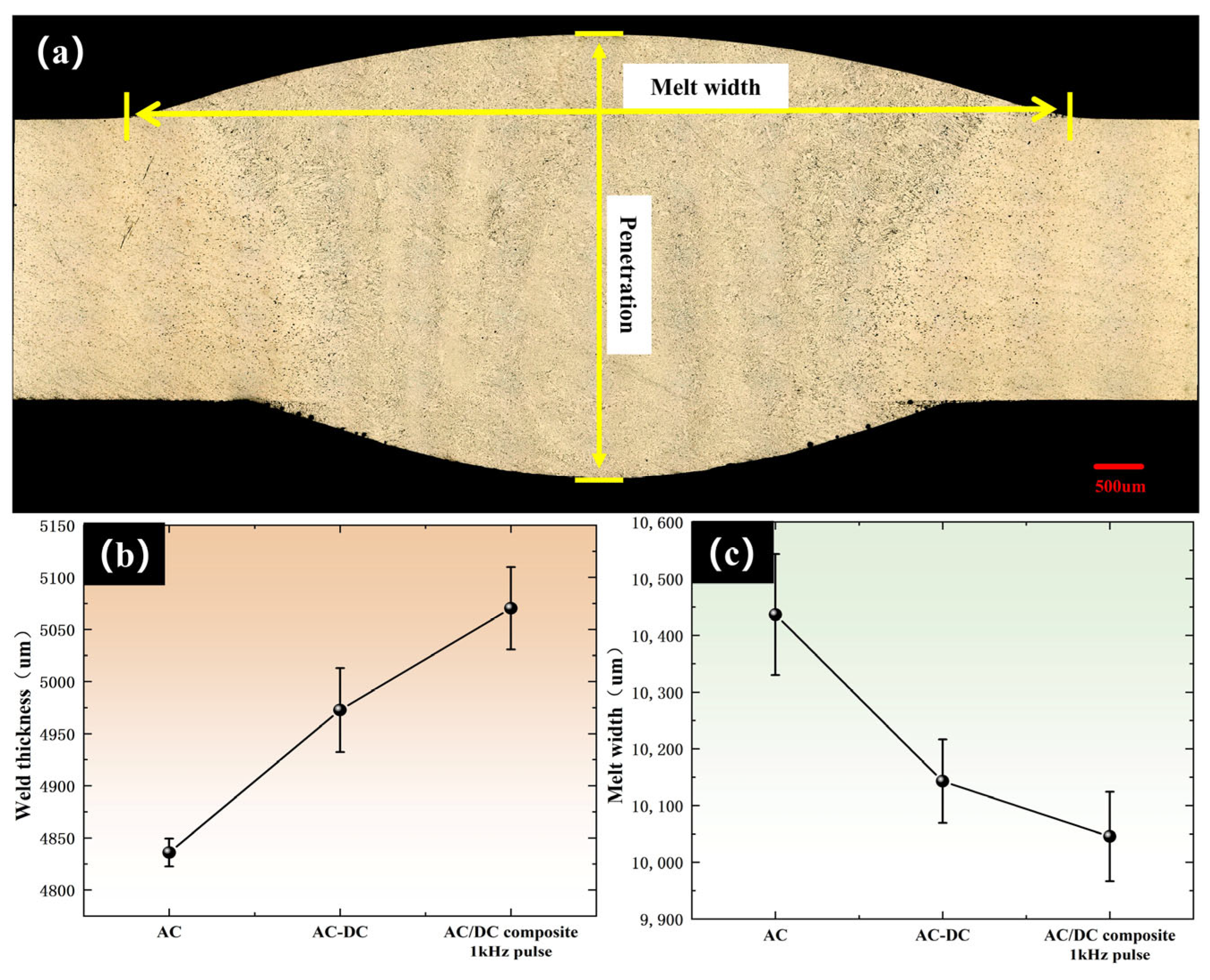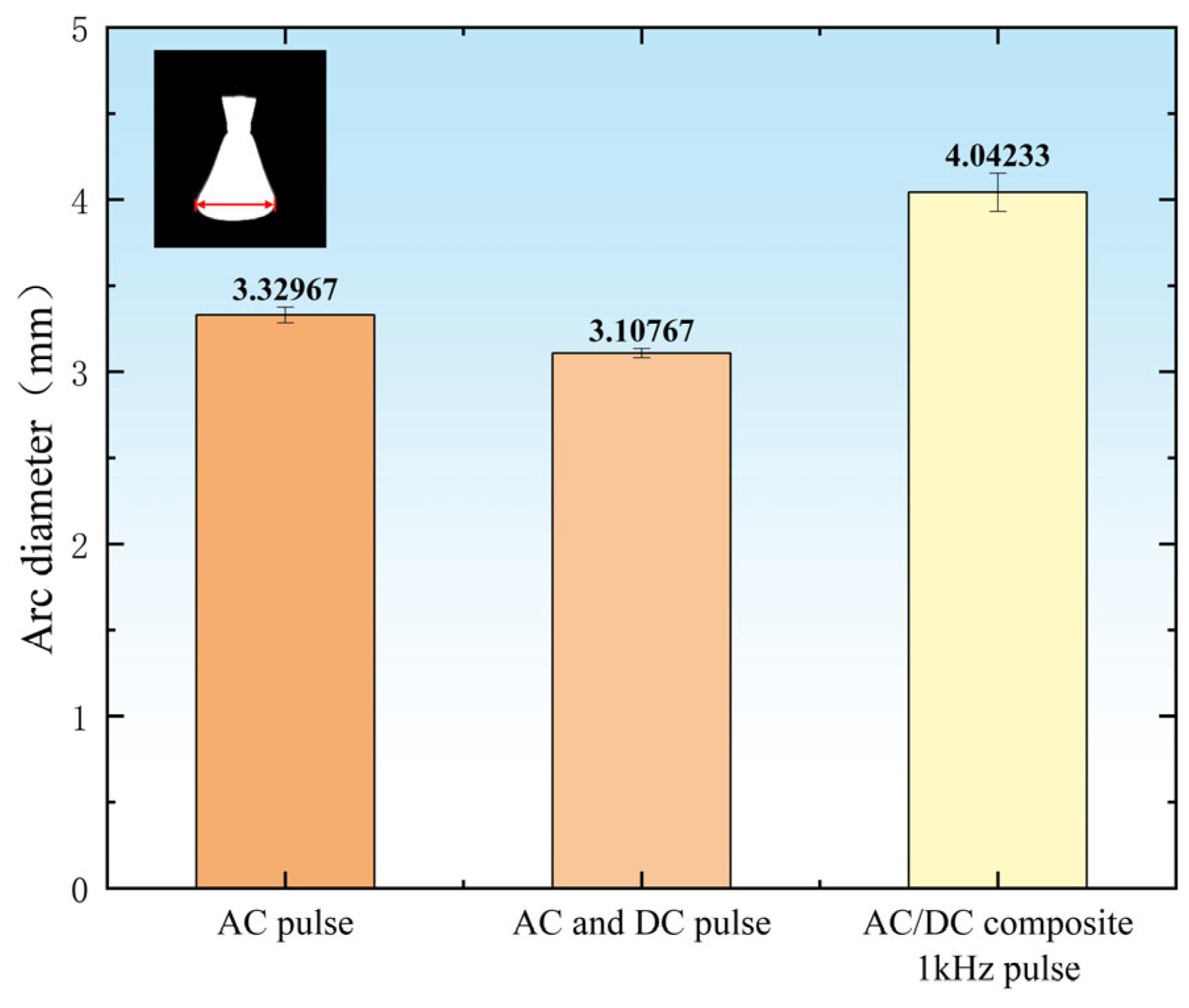 The AC/DC composite 1 kHz pulse process features flexibility, arc contraction (The arc diameter has increased to 4.042 mm), and enhanced input efficiency of the molten pool. The “stirring” of the molten pool accelerates its cooling and reduces the heat-affected zone.