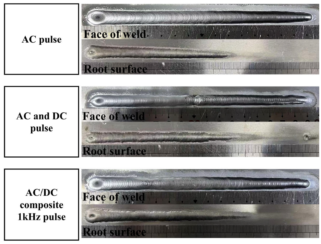 The variation in the heat source electrical signal alters the arc morphology, thereby influencing joint melting and solidification behavior. Figure 8 illustrates the macroscopic appearance of weld beads obtained under three different processes. All three welds exhibit favorable surface formation without noticeable defects and present an aesthetically pleasing appearance. Throughout the welding process, no spatter or arc extinction issues occurred, indicating stable welding operation. The top surfaces of all welds display a fish-scale pattern, attributed to the periodic alternation of the electrical signals. Among the three weld types, it is clearly observed that the weld produced with the AC/DC composite 1 kHz pulsed heat source is the first to achieve full penetration.