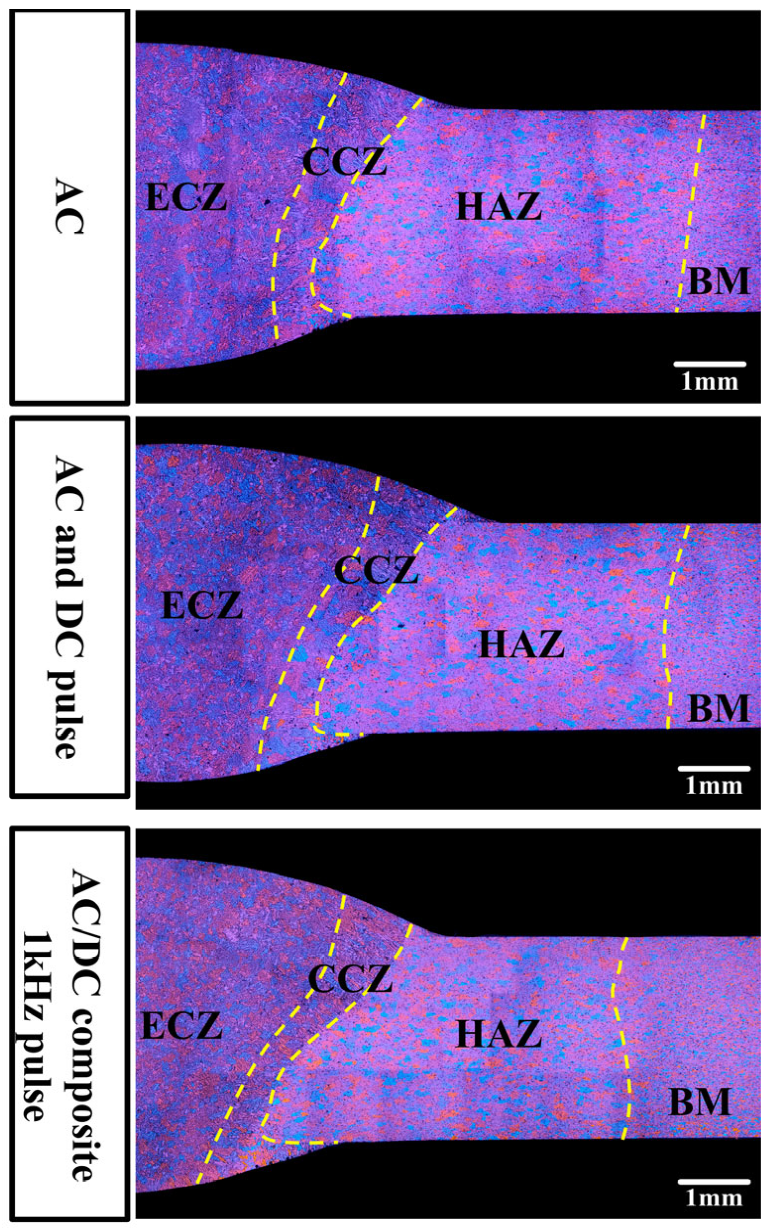 The metallographic designs of the joint sections of the three groups of processes are shown in Figure 11. The molten pools of the three groups of joints are all single-sided welded and double-sided formed, and the depth of the molten pools exceeds the thickness of the base material. Among the three groups of processes, the CCZ of the AC/DC composite 1 kHz pulse weld is the narrowest, and the width of the HAZ is the smallest. According to the principles of heat conduction and molecular dynamics, the arc contraction of the AC/DC composite 1 kHz pulse heat source signal is stronger, the radiation range of the arc heat energy is reduced, and the flow of molten metal in the molten pool accelerates the heat transfer between atoms and molecules from top to bottom, reduces the lateral heat transfer on the surface of the molten pool, lowers the width of the HAZ interval, and reduces the softening of the joint.