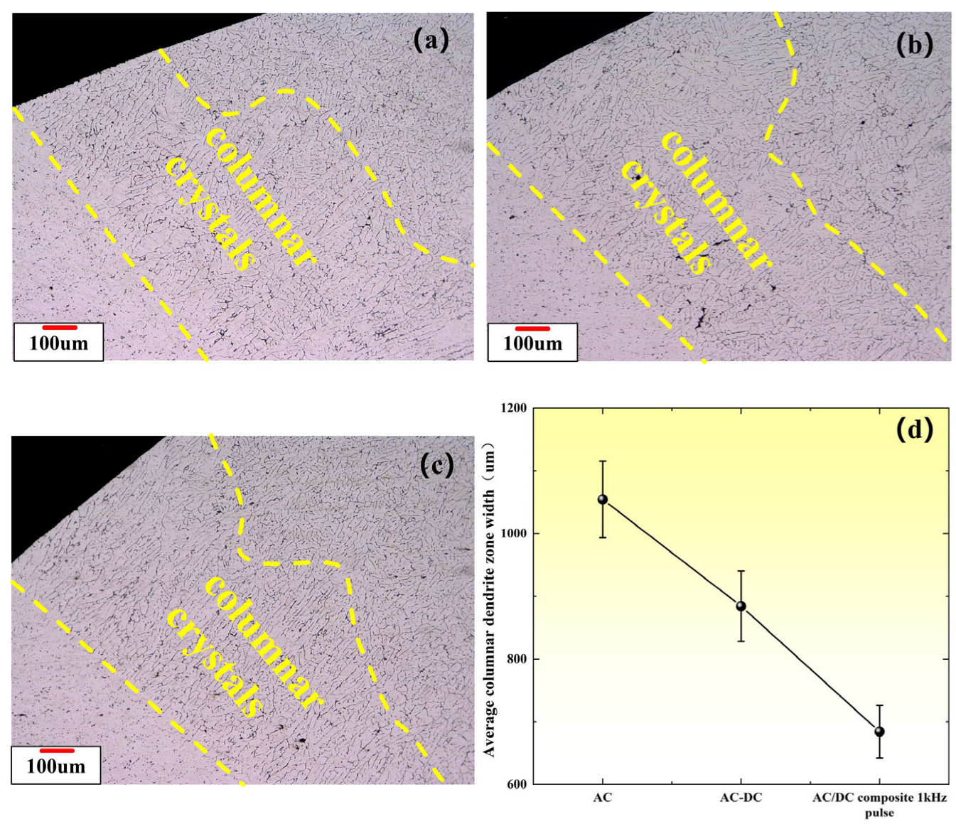 Figure 12 illustrates the microstructure of the columnar crystals zone (CCZ) within the weld seam. The width of the CCZ in welds using AC/DC pulse signals is reduced by 16.15% compared to those using AC pulse signals. Furthermore, the CCZ width in welds employing the AC/DC composite 1 kHz pulse signal is reduced by 35.13% compared to AC pulse welds. The narrowest CCZ is observed in the AC/DC composite 1 kHz pulse welds.