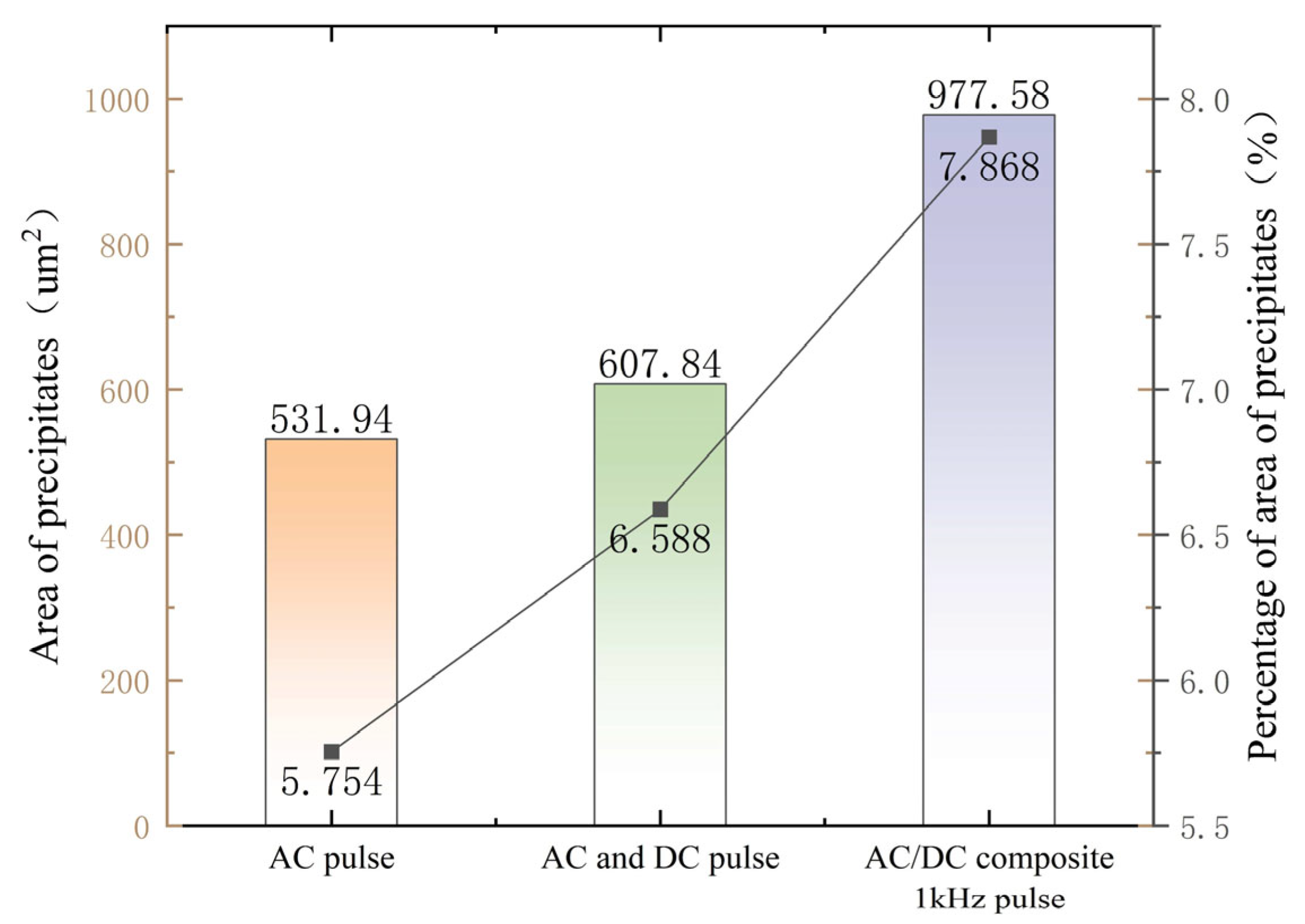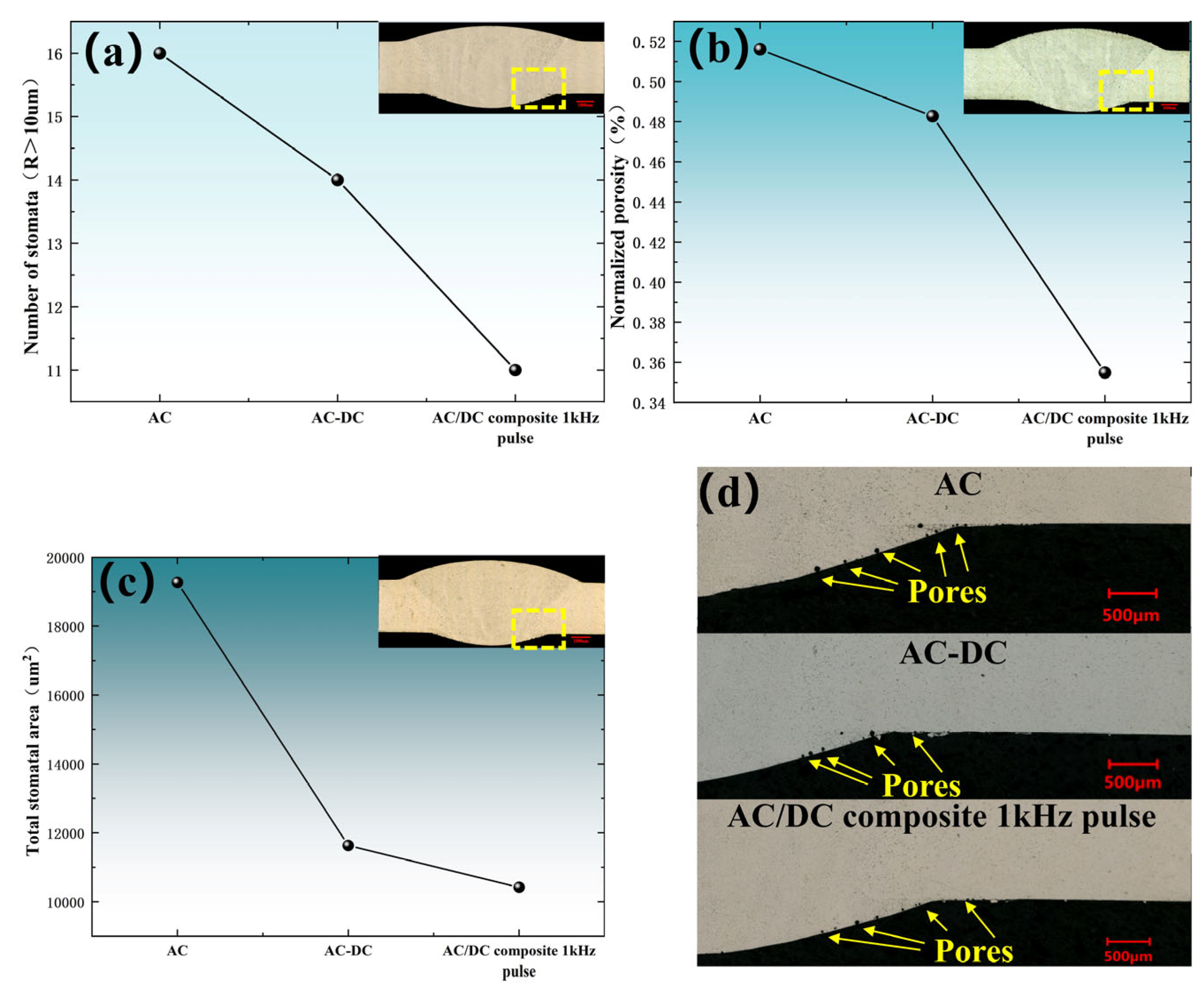 Figure 13 presents the porosity characteristics (number, normalized area, and total area) of welds processed under three different conditions. Compared to AC pulse welds, the total porosity area, number of pores, and normalized porosity in AC/DC pulse welds are reduced by 39.6%, 3.3%, and 12.5%, respectively. When using the AC/DC composite 1 kHz pulse signal, these values are further reduced by 45.9%, 16.1%, and 31.2%, respectively, compared to AC pulse welds.
