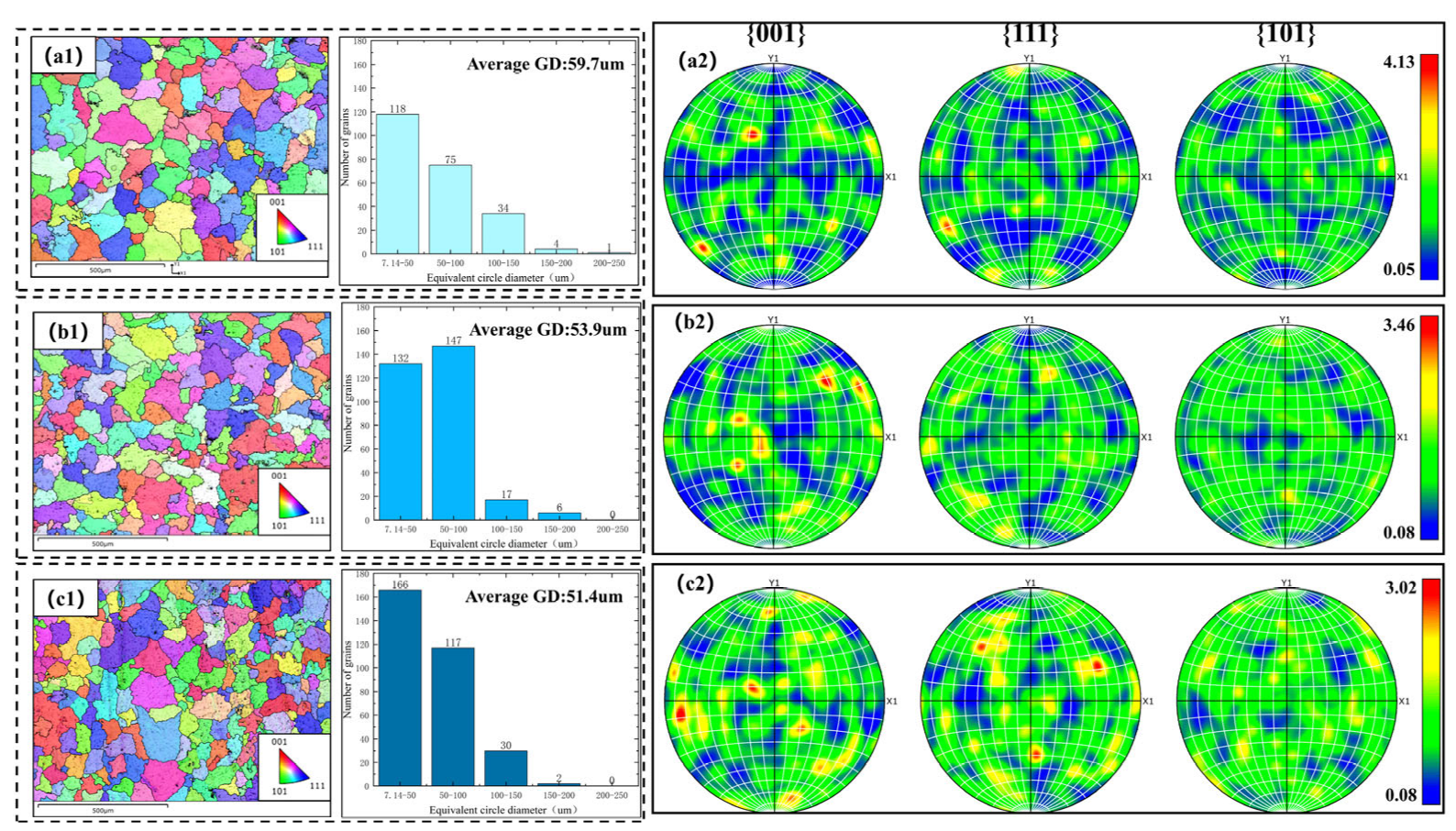 Figure 14. (GB + IPF) diagrams, grain statistics, and polar diagrams of centers of three groups of process welds ((a1,a2) AC pulse process weld, (b1,b2) AC/DC pulse process weld, (c1,c2) AC/DC composite 1 kHz pulse process weld).