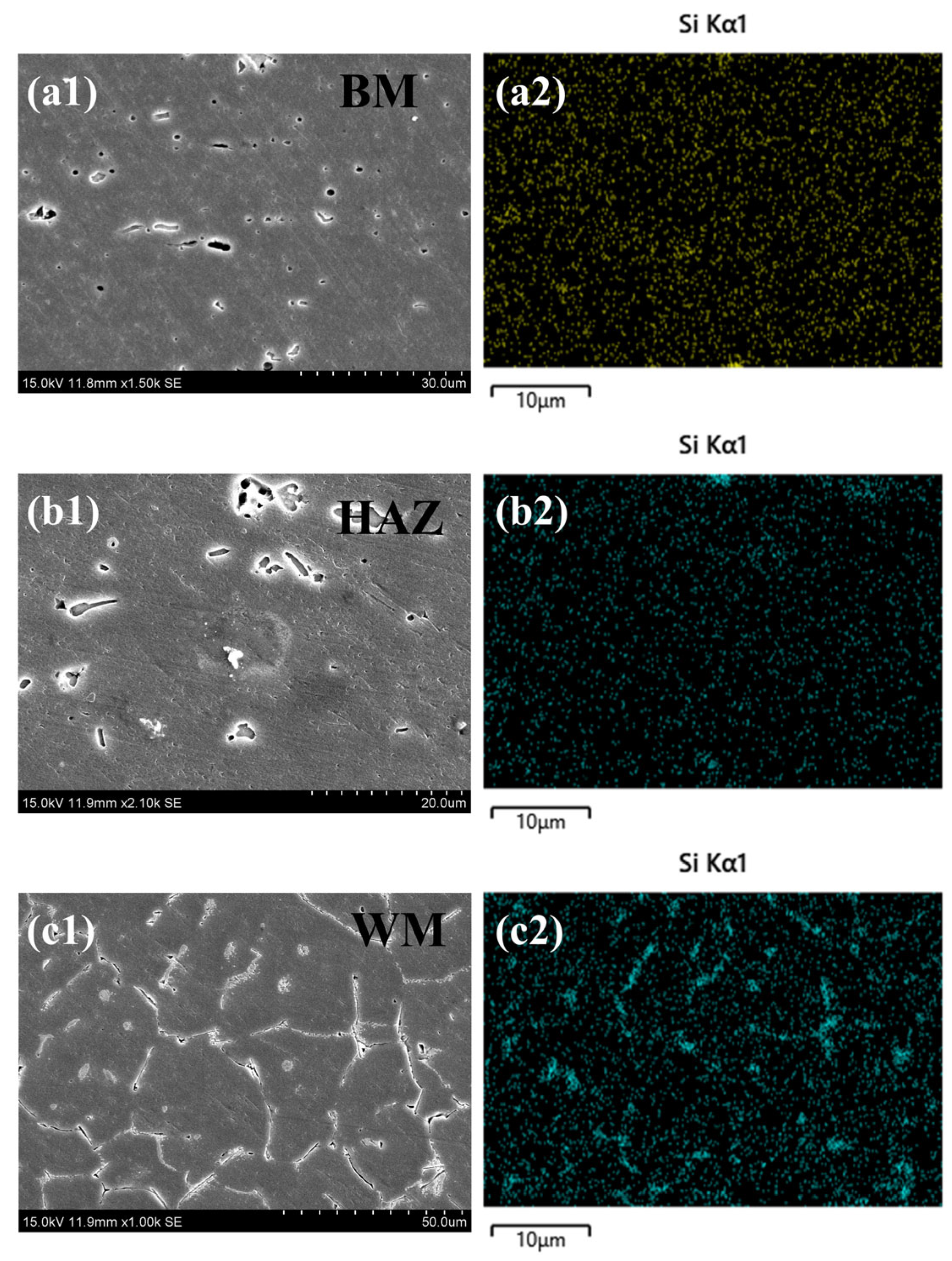Figure 16. SEM surface scan distribution of Si elements in each region of Process 3. ((a1,a2) SEM surface scanning morphology and Si distribution of BM, (b1,b2) SEM surface scanning morphology and Si distribution of HAZ, (c1,c2) SEM surface scanning morphology and Si distribution of WM).