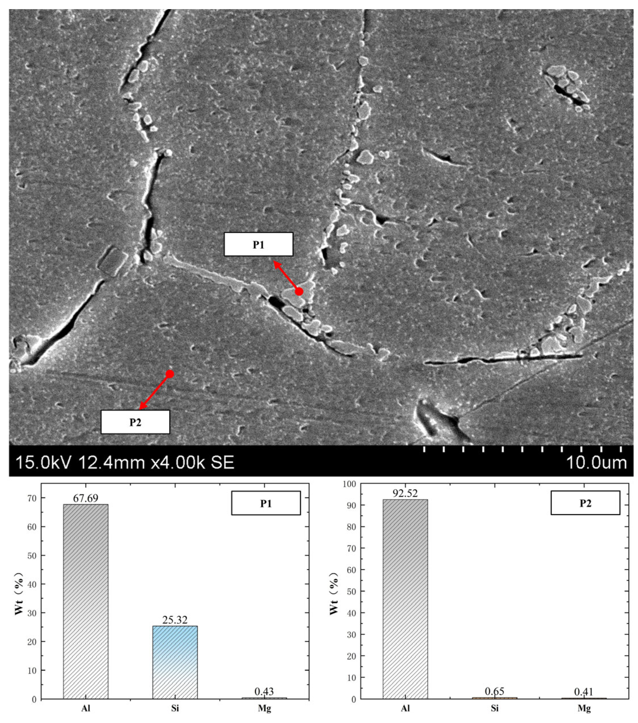 The atomic arrangement at the grain boundaries is irregular, and the atomic activity is relatively high. Si atoms also tend to aggregate near the grain boundaries. A large amount of eutectic Si combines with α -Al to form an Al-Si eutectic structure [29]. The energy at the grain boundaries is relatively high, while the atomic diffusion activation energy is relatively low, making it easier for silicon atoms to migrate and aggregate towards the grain boundaries. There is a difference in the solubility of silicon in the solid phase and the liquid phase. As solidification proceeds, the concentration of silicon in the liquid phase gradually increases. At the solid–liquid interface, silicon atoms tend to diffuse into the liquid phase. Since the grain boundaries are the last solidified areas during the solidification process, silicon in the liquid phase will be enriched at the grain boundaries, thereby promoting the segregation of Al-Si eutectic distribution at the grain boundaries.