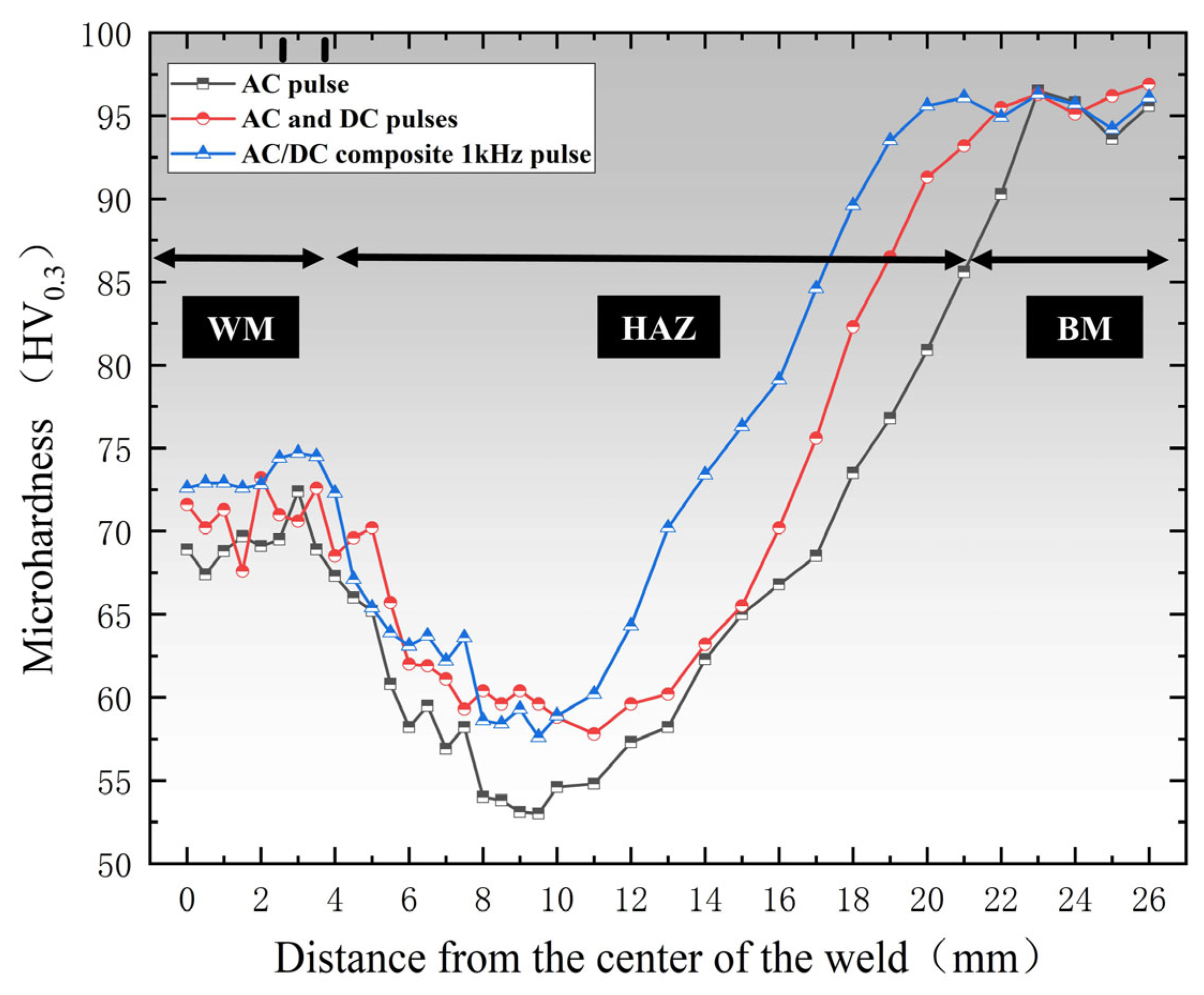 AC/DC compound 1 KHZ pulse technology improves the hardness of the weld joint; WM can be up to 77.6% of the average hardness of the parent metal hardness.