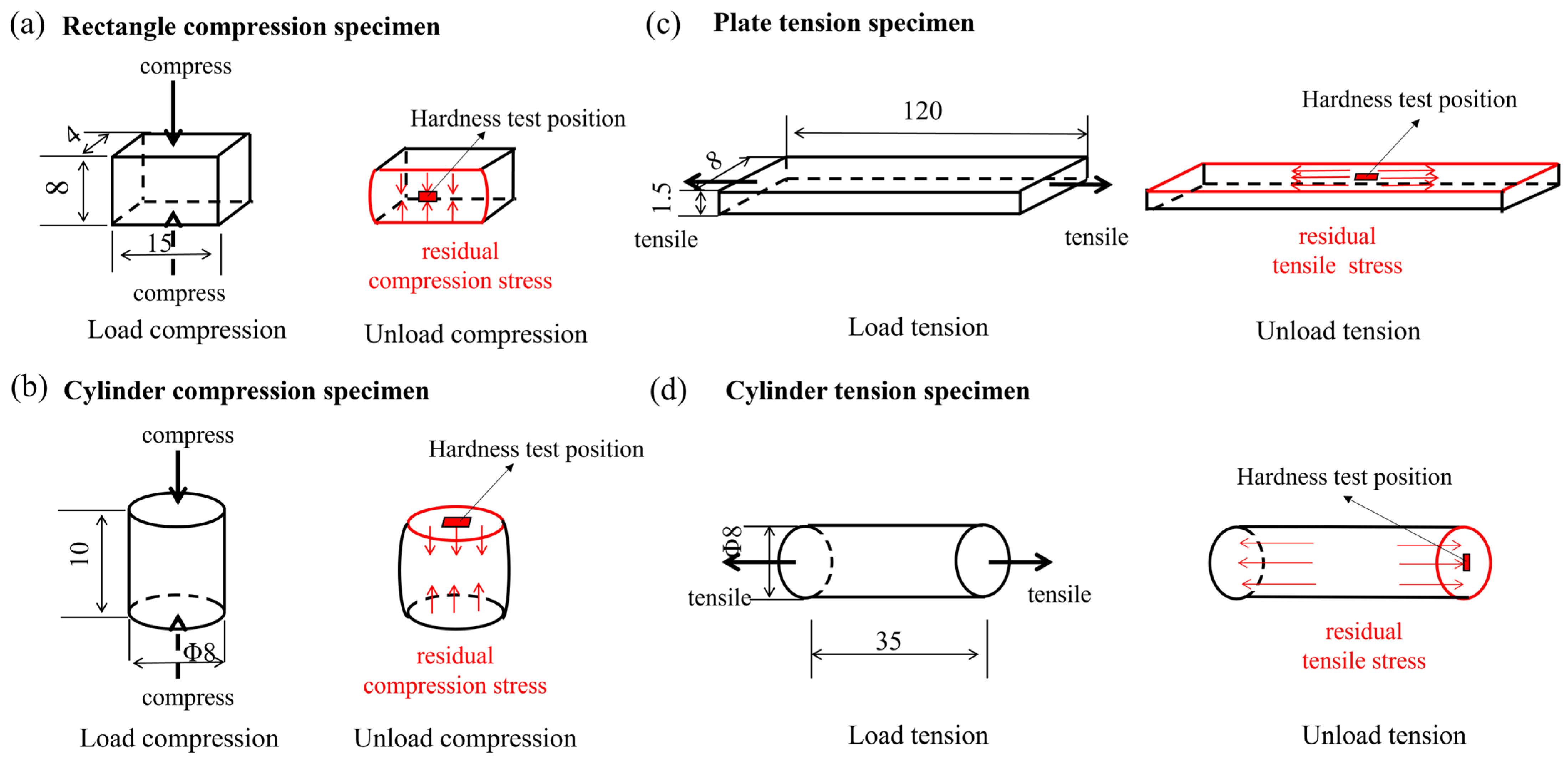 Schematic of residual stress distribution of specimens under compression (tension): (a) rectangle compression specimens; (b) cylinder compression specimen; (c) plate tension specimen; (d) cylinder tension specimen.