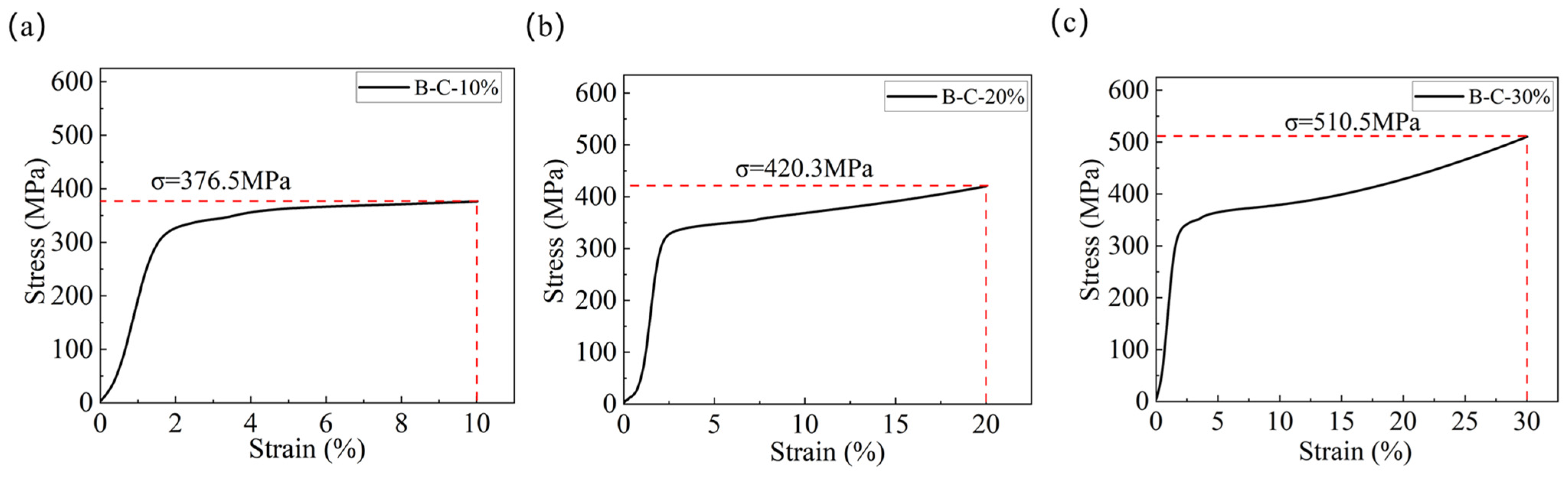 Compression curves of cylinder compression specimens: (a) B-C-10%; (b) B-C-20%; (c) B-C-30%.