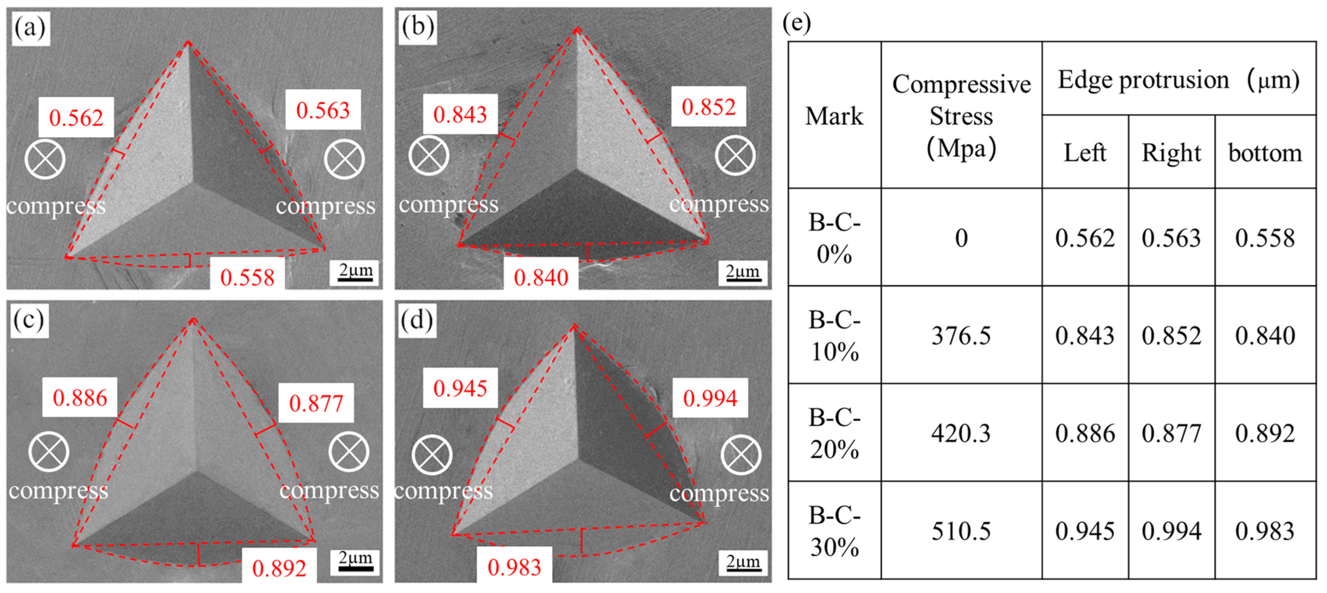 SE images of nanoindentation impressions of rectangle compression specimens: (a) A-C-0%; (b) A-C-5%; (c) A-C-7.5%; (d) A-C-10%; (e) edge protrusion data.
