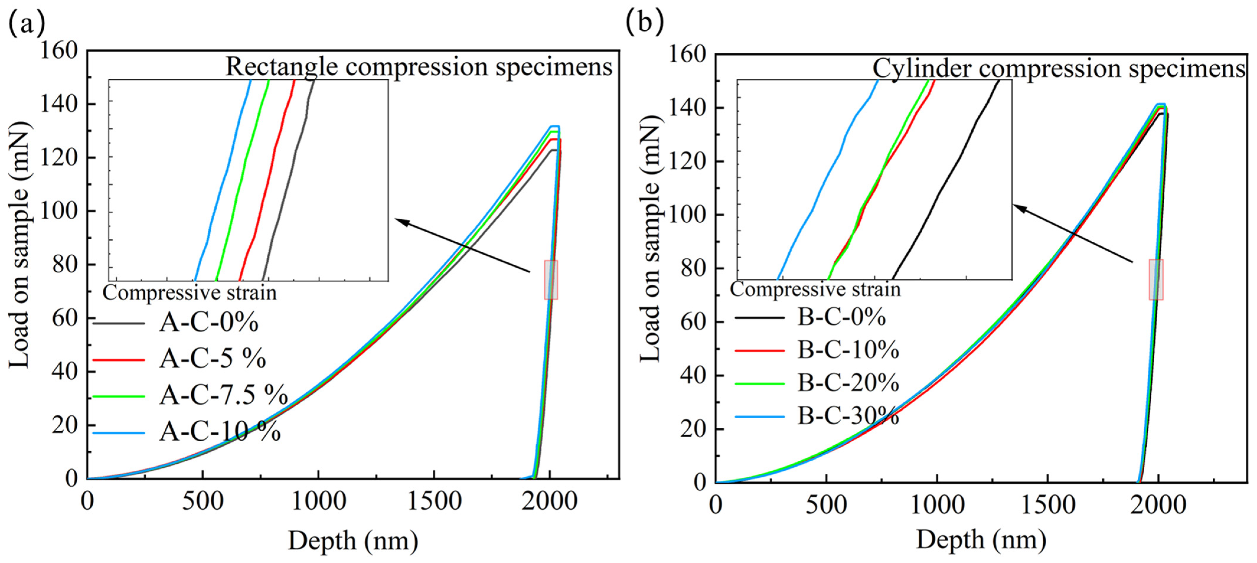 Load–displacement curves under compression at a fixed penetration depth of 2000 nm: (a) rectangle compression specimens; (b) cylinder compression specimens.