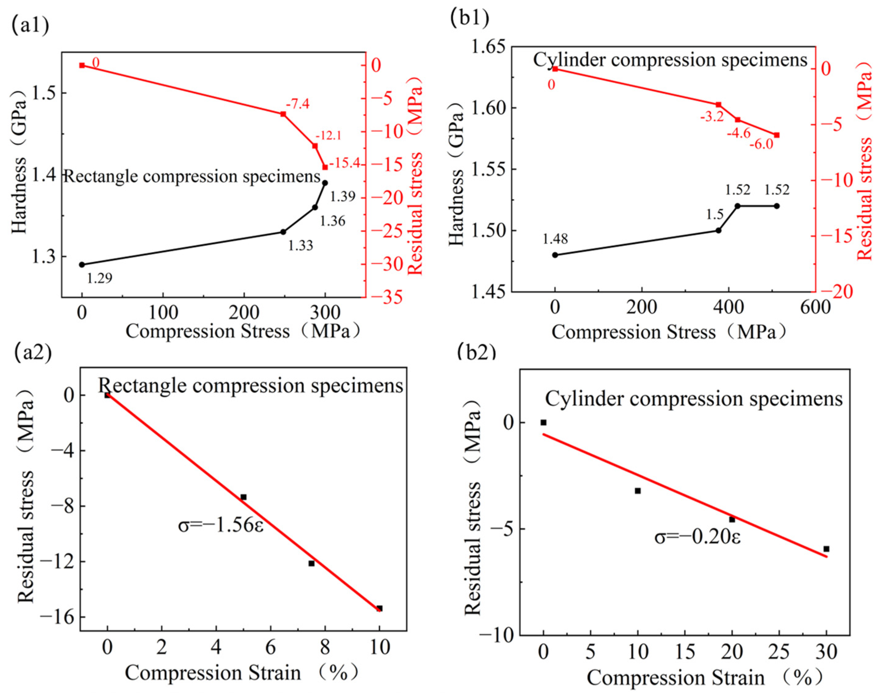 (a1) Hardness and residual stress curves of rectangle compression specimens with compression stress; (a2) residual stress curves of rectangle compression specimens with compression strain; (b1) hardness and residual stress curves of cylinder compression specimens with compression stress; (b2) residual stress curves of cylinder compression specimen with compression strain.