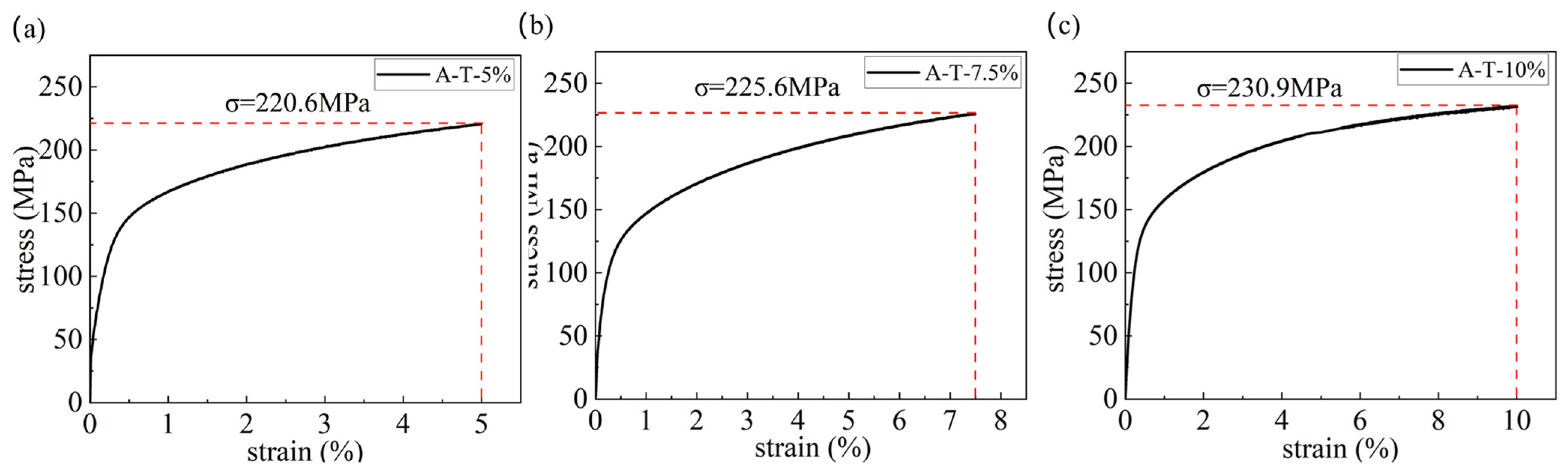 Tension curves of plate tension specimens: (a) A-T-5%; (b) A-T-7.5%; (c) A-T-10%.
