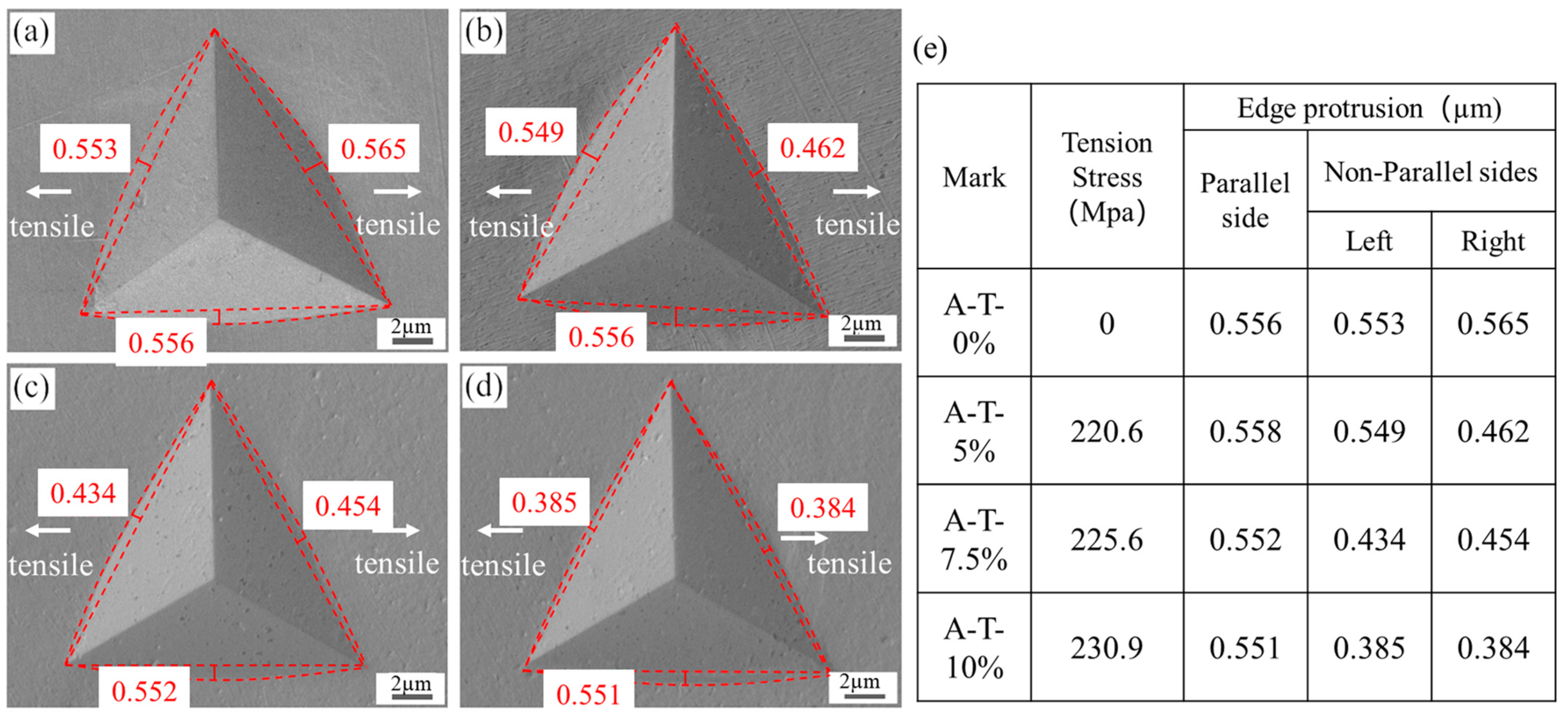 SE images of nanoindentation impressions of plate tension specimens: (a) A-T-0%; (b) A-T-5%; (c) A-T-7.5%; (d) A-T-10%; (e) edge protrusion data.