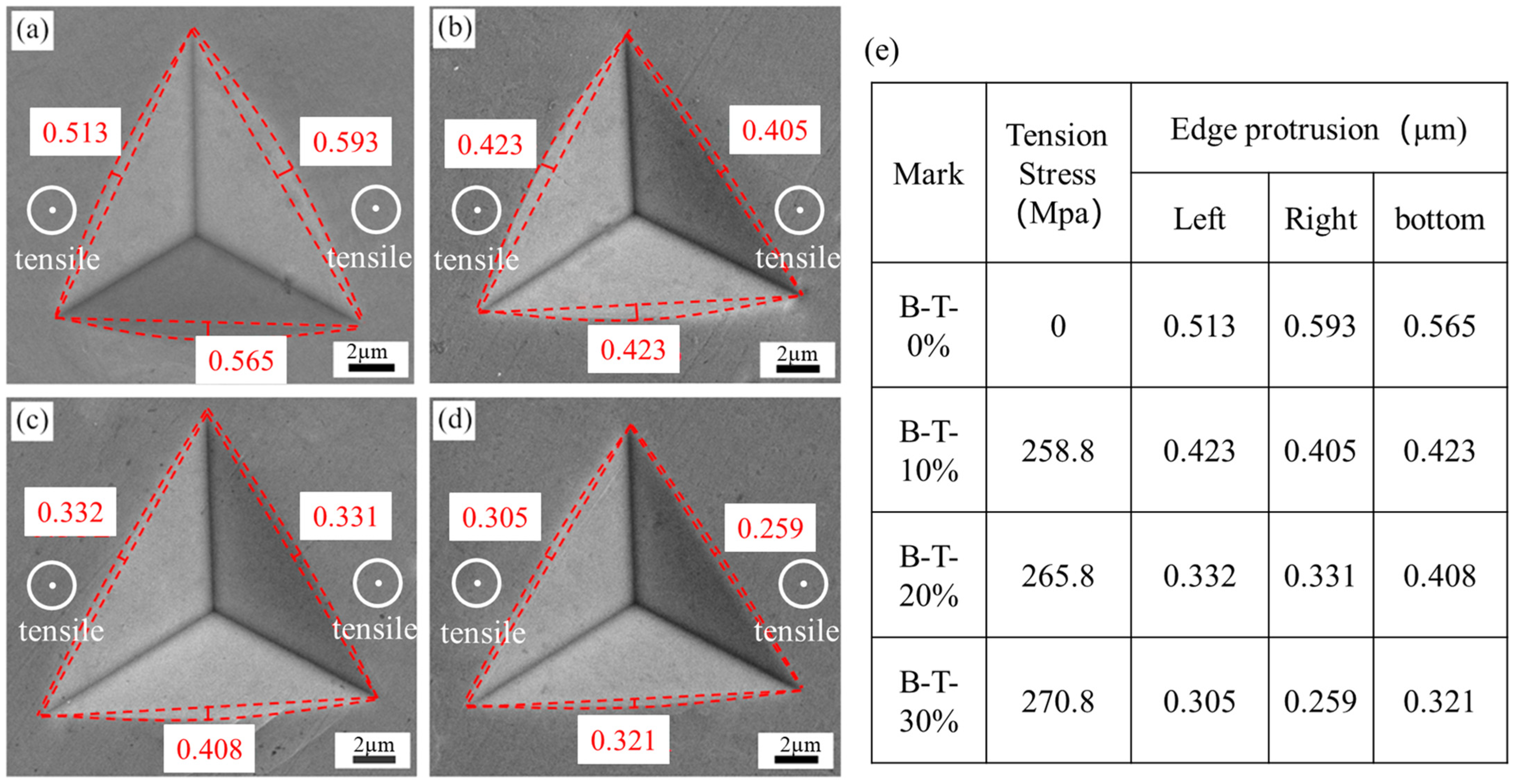 SE images of nanoindentation impressions of cylinder tension specimens: (a) B-T-0%; (b) B-T-10%; (c) B-T-20%; (d) B-T-30%; (e) edge protrusion data.