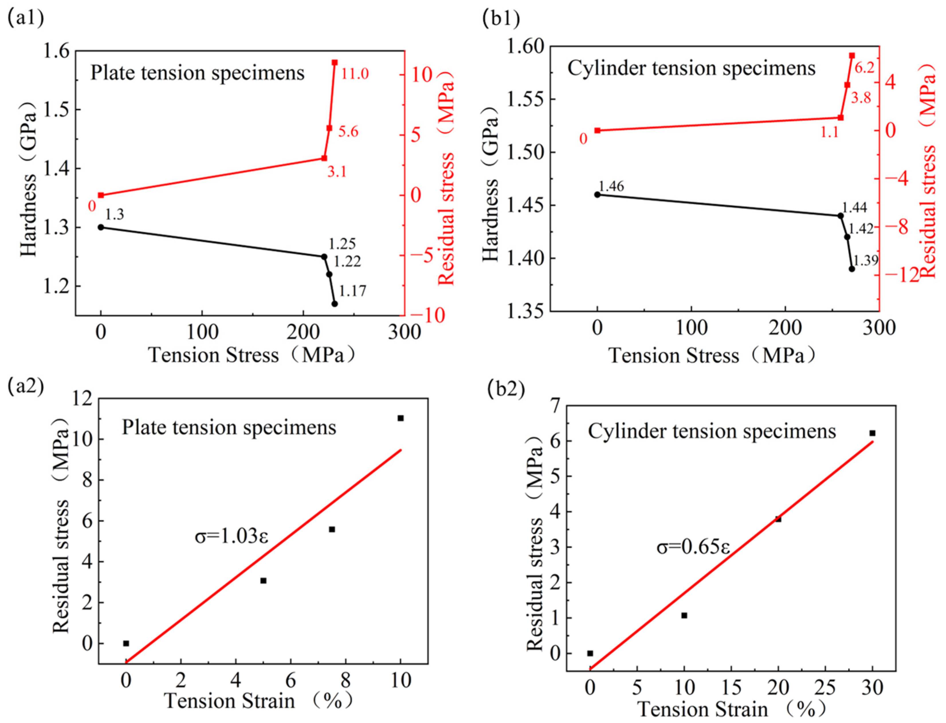 (a1) Hardness and residual stress curves of plate tension specimens with tension stress; (a2) residual stress curves of plate tension specimens with tension strain; (b1) hardness and residual stress curves of cylinder tension specimens with tension stress; (b2) residual stress curves of cylinder tension specimen with tension strain.