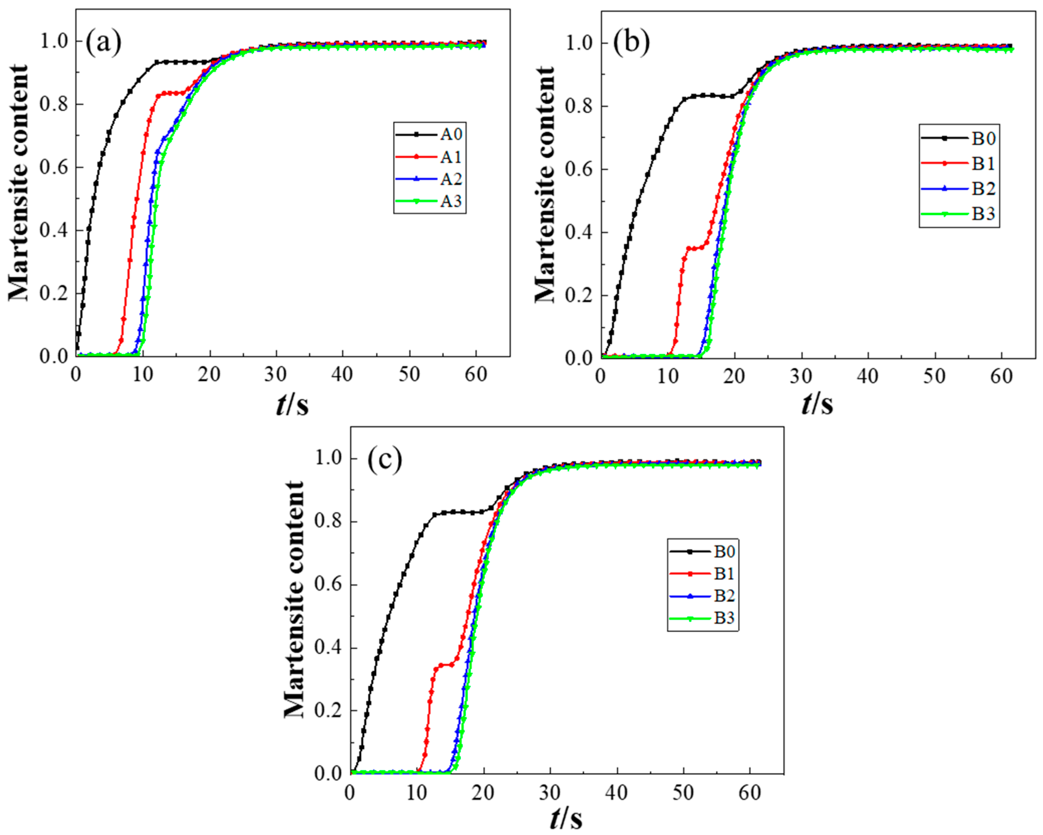 - The established temperature-phase transformation-stress coupled model comprehensively accounts for the effects of heat exchange, phase transformation, and phase transformation latent heat, achieving high accuracy. The construction of this high-precision coupled model provides a theoretical foundation for understanding the stress distribution and deformation behavior of gigapascal-grade ultra-high-strength steel plates during cooling under complex conditions.