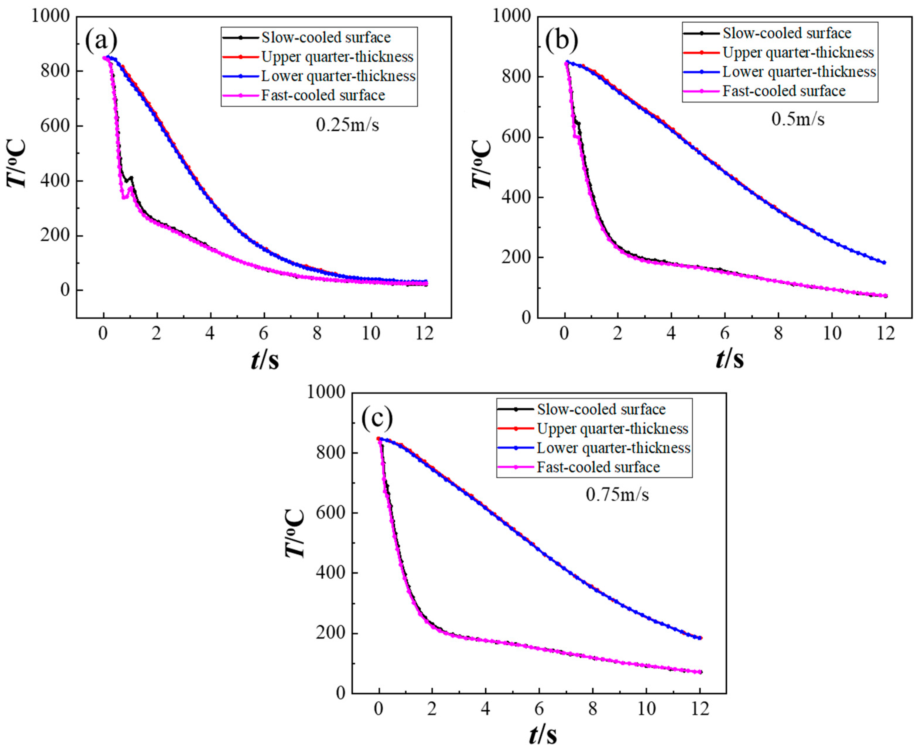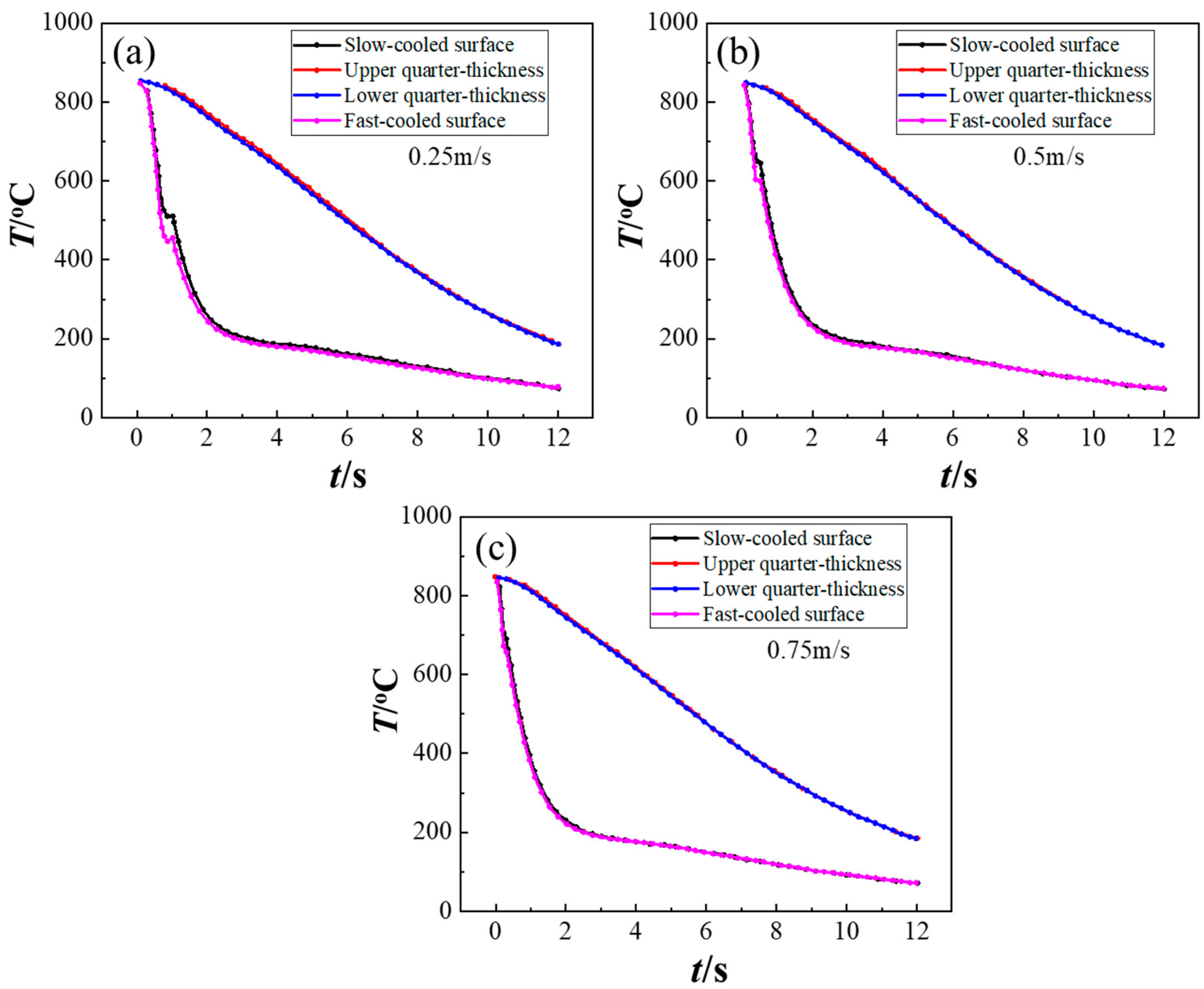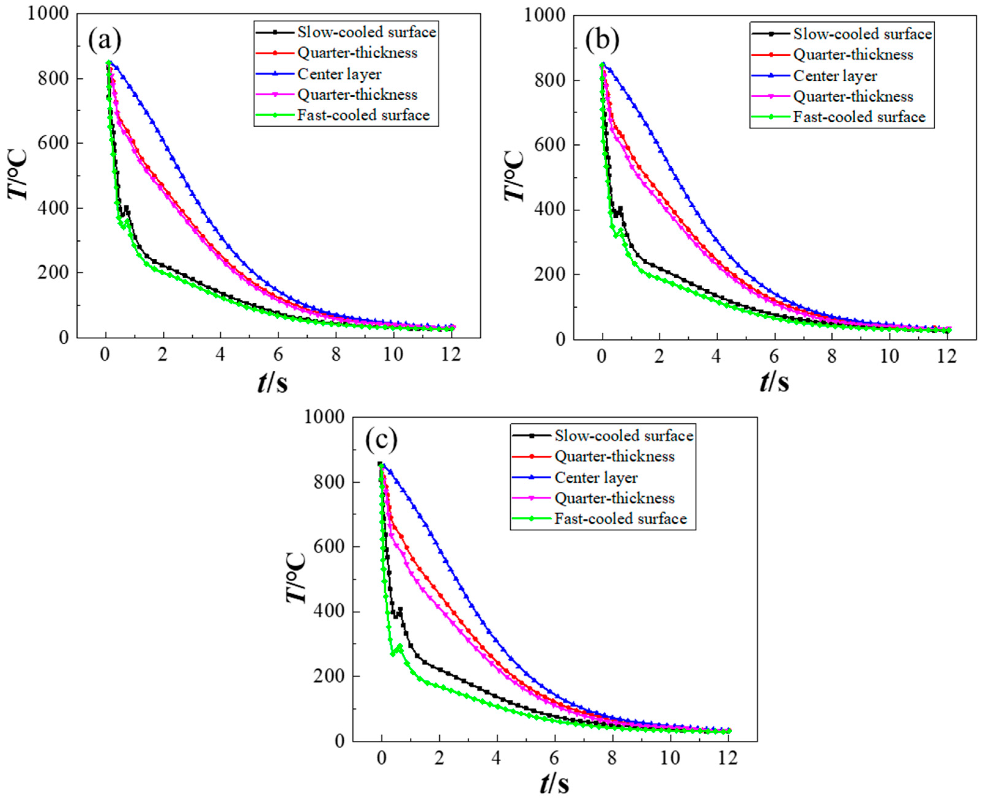 - During single-side cooling, the cooled surface contracts and concaves due to lower temperature and phase transformation. When a single-side cooling device moves along the plate, the cooled surface undergoes an evolution from concavity to transverse bending deformation. During double-side cooling, if the upper and lower surfaces cool asynchronously, inconsistencies in temperature and martensitic phase transformation-induced expansion between the surfaces lead to flatness issues.