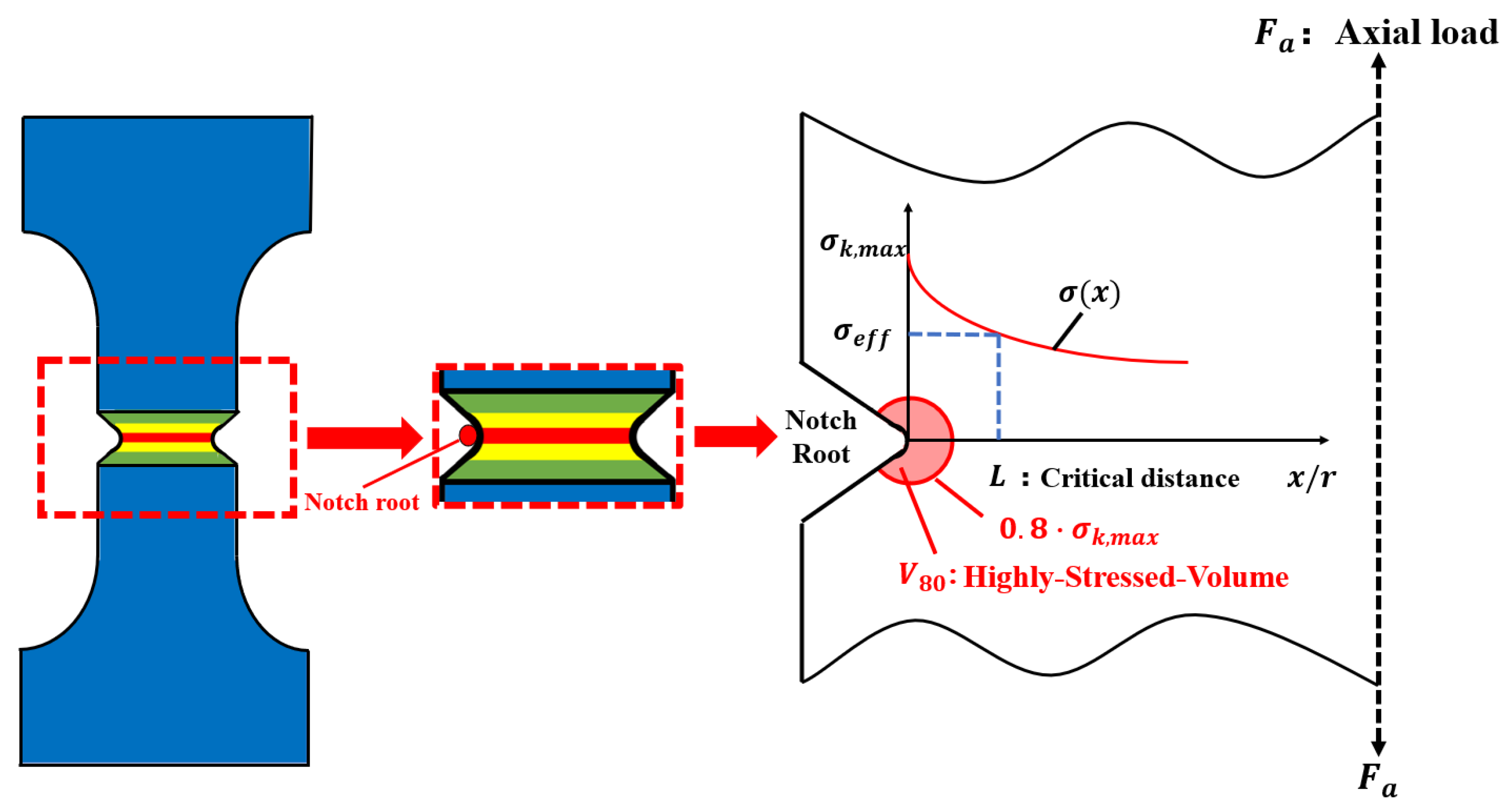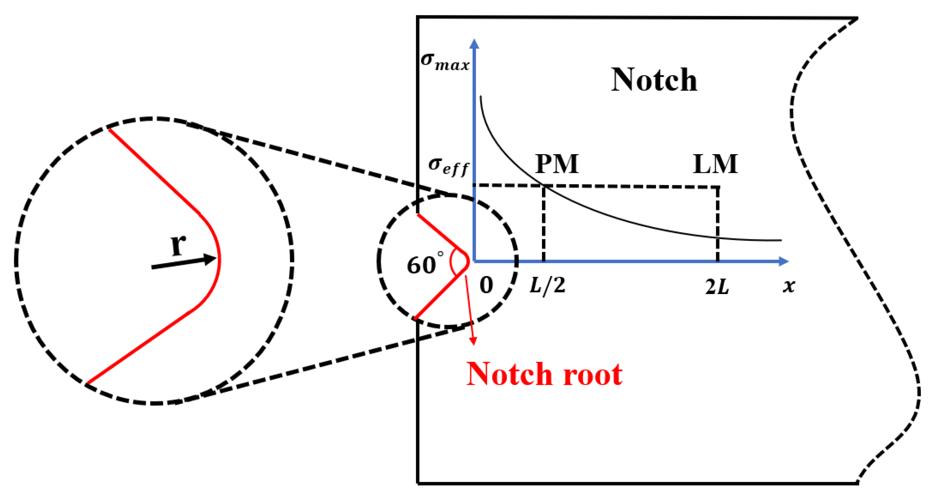 - He, J.C.; Zhu, S.P.; Taddesse, A.T.; Niu, X. Evaluation of critical distance, highly stressed volume, and weakest-link methods in notch fatigue analysis. Int. J. Fatigue 2022, 162, 106950. [Google Scholar] [CrossRef]